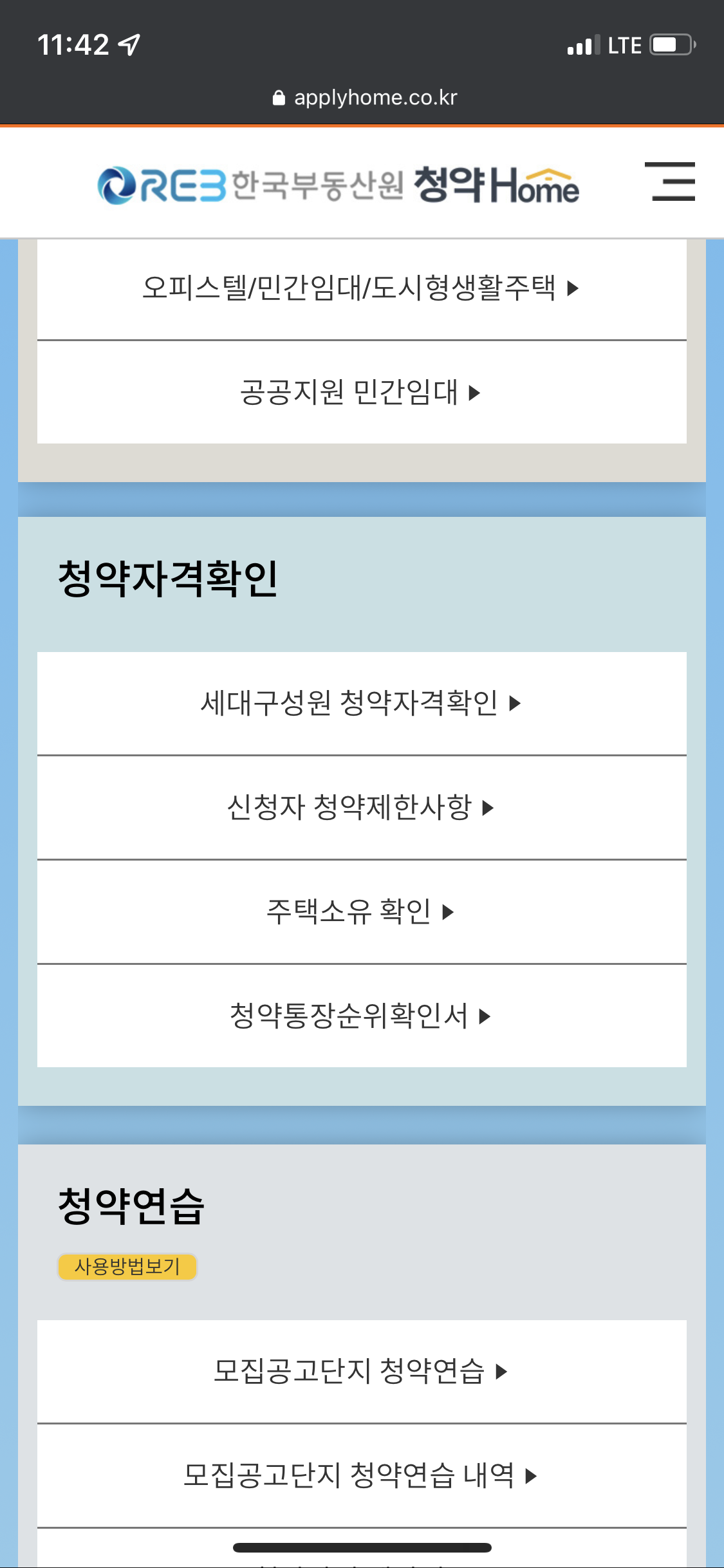 주택소유 확인, 청약통장 순위 확인, 세대 구성원 청약자격확인, 신청자 청약제한사항을 확인할 수 있으며, 그 밖의 청약 연습이나 임대주택도 확인이 가능합니다!