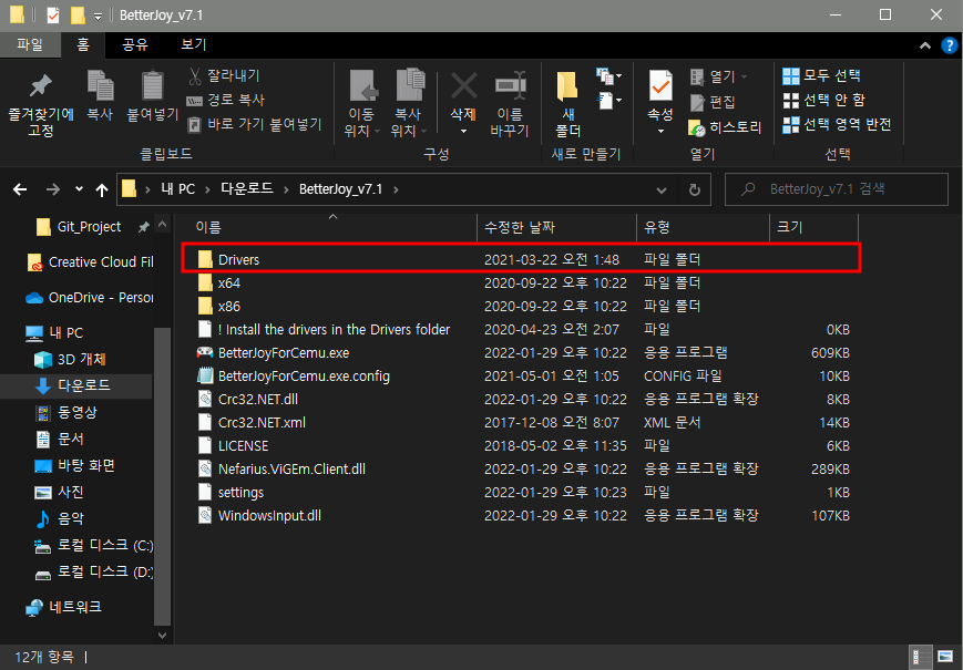 조이콘과 PC 블루투스 연동이 끝났다면 위에서 알려드린 링크로 압축파일 다운로드하시고 압축을 푸신 다음 아래 사진에 있는 순서대로 Drivers 폴더에 접속해주세요!