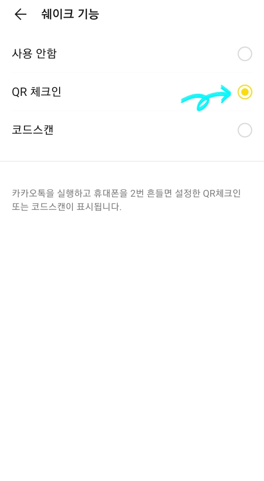 카카오톡 QR코드 체크인 쉐이크 기능 설정방법