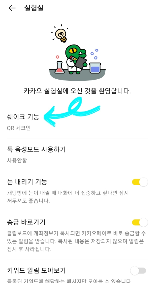 3. 실험실에 들어가면 쉐이크 기능 이라고 화면에 보이실 겁니다. 들어가주세요!