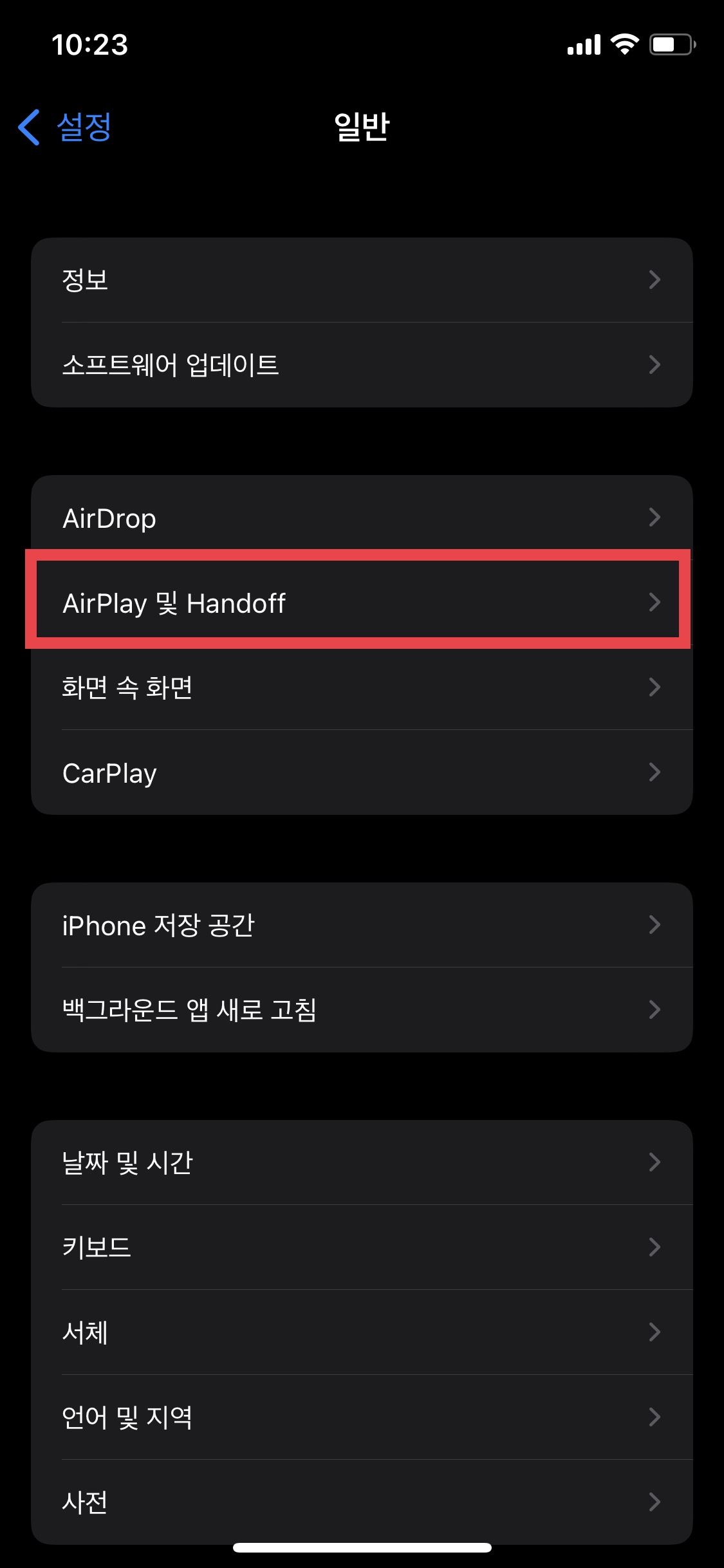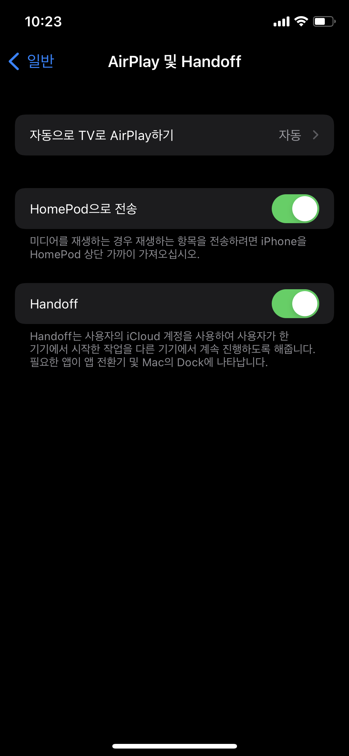 핸드오프 기능은 사전에 아이폰 설정에서 [일반] - [AirPlay 및 Handoff] - [Handoff]를 활성화 시켜주세요!(사진참조)