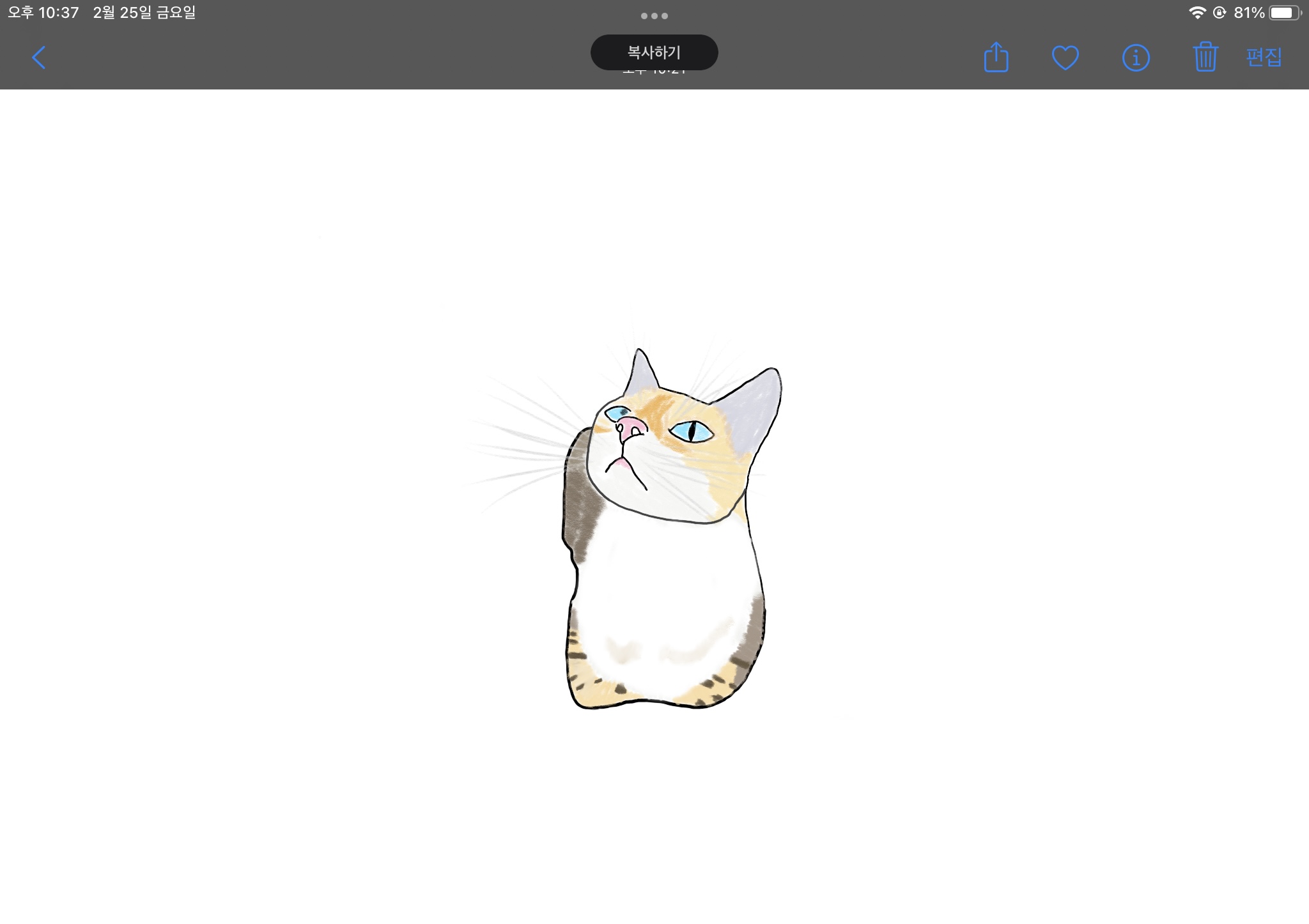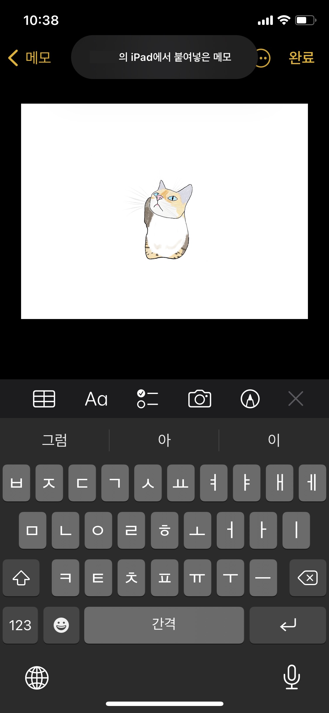 짜잔~ 아이패드에서 그렸던 고양이가 아이폰 메모장으로 불러오는 것을 성공했습니다! 정말 신기한 기능이지 않나요?ㅎㅎ