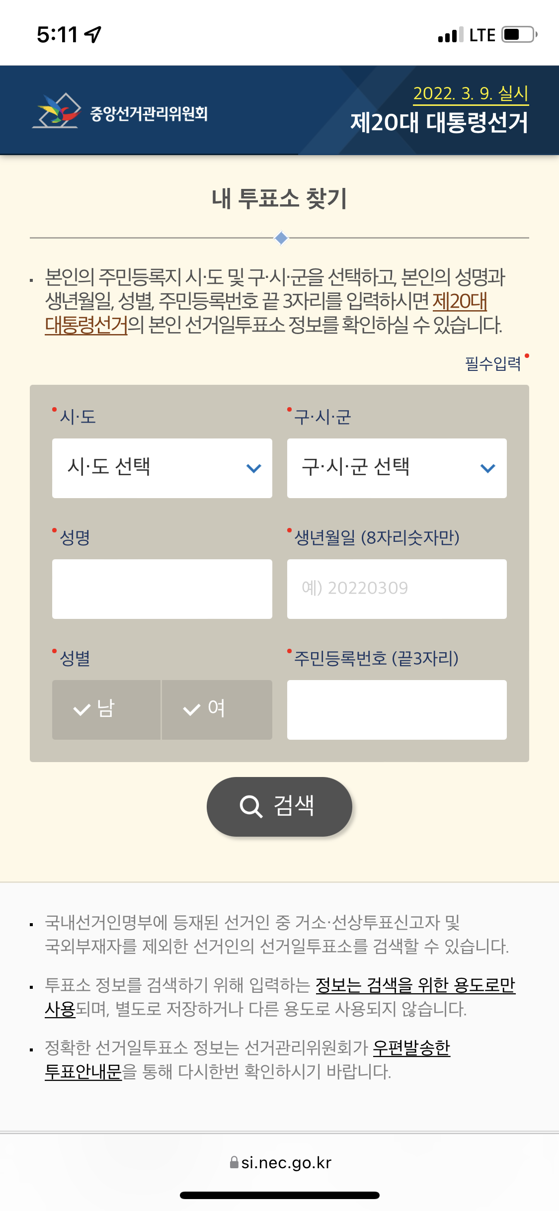 내 투표소 찾기 기능은 본인이 살고있는 지역과 성명, 생년월일, 성별, 주민등록번호 끝 3자리를 입력하면