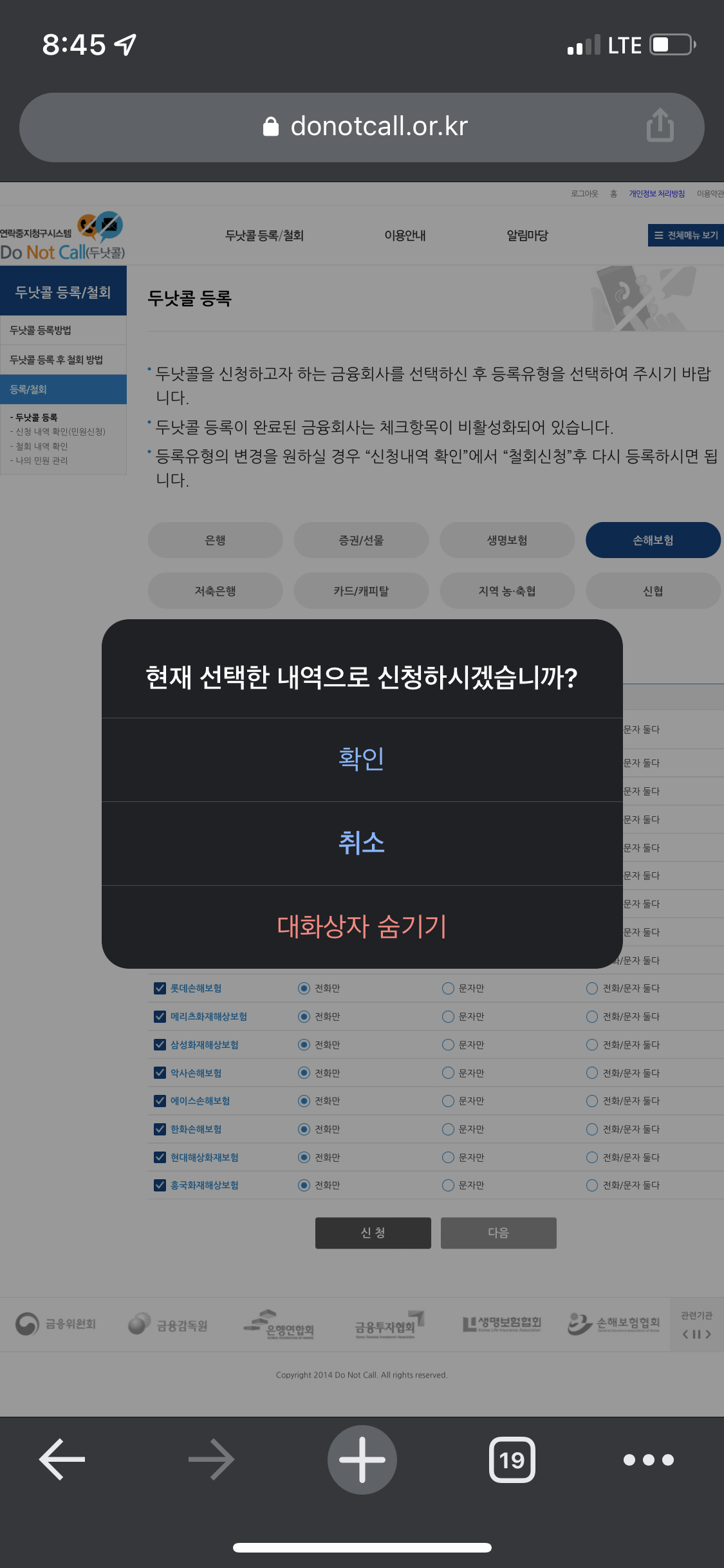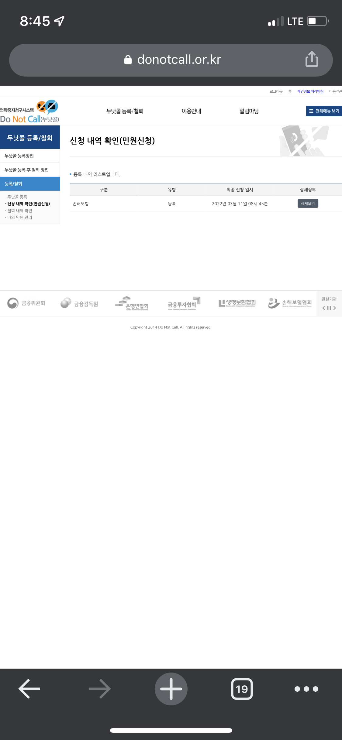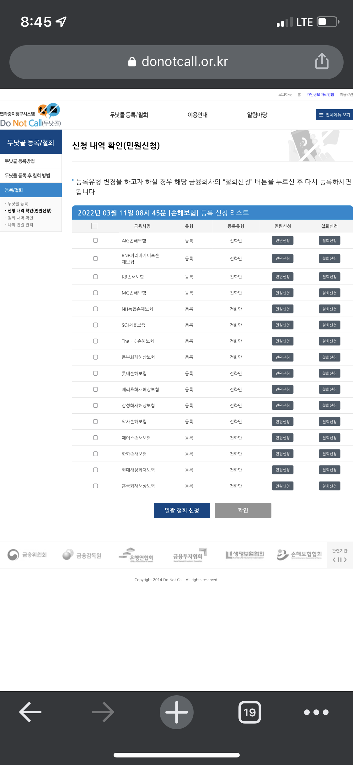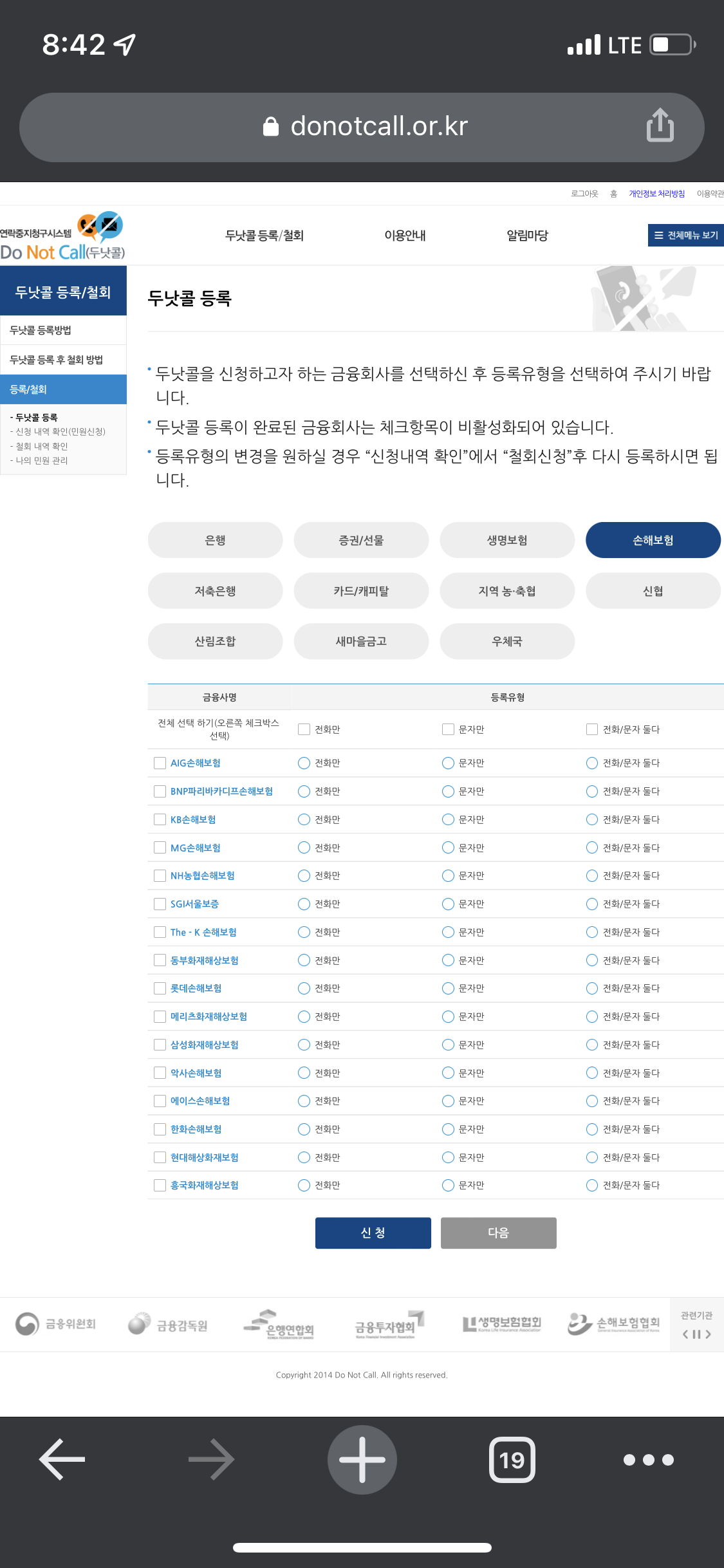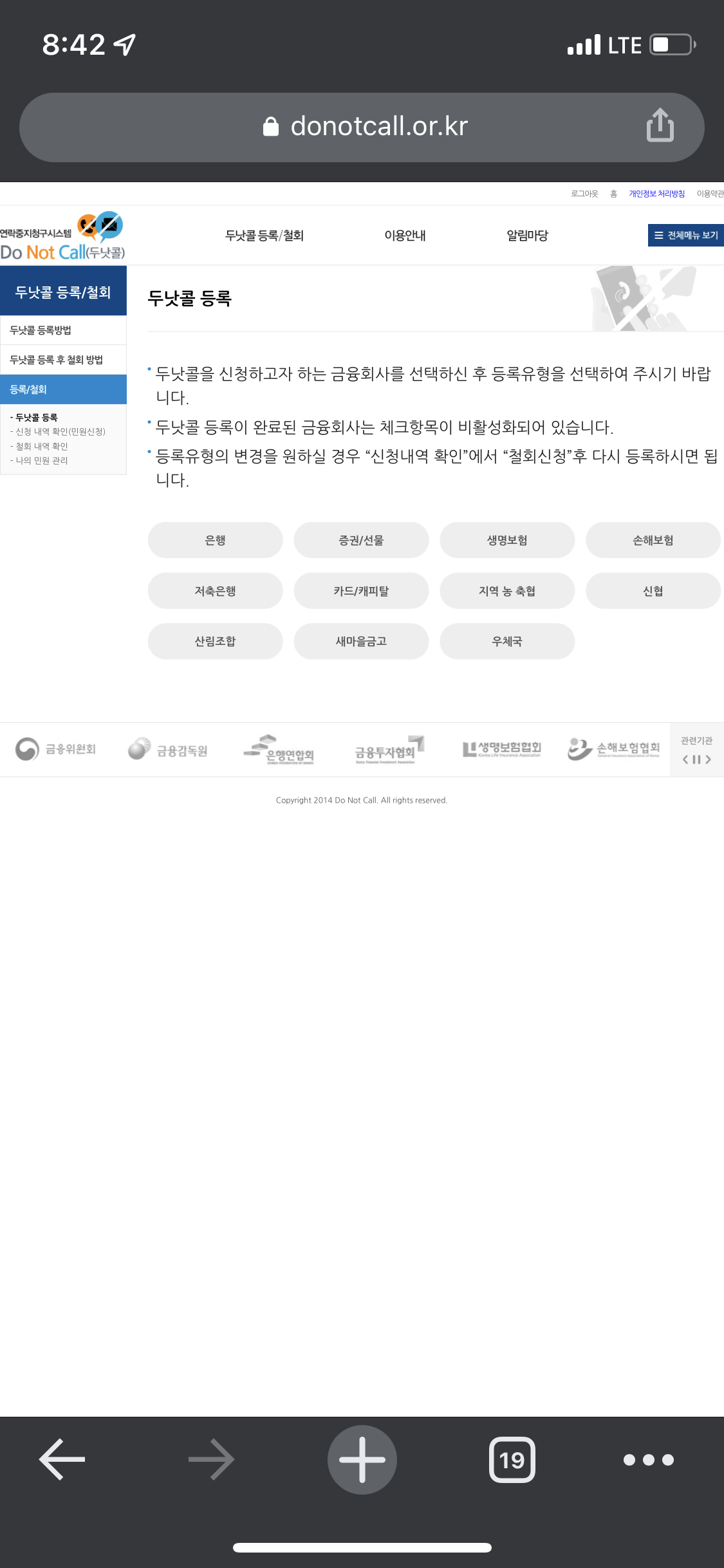 두낫콜 등록 탭에 있는 금융회사(은행, 보험) 중에서 수신 거부를 원하는 항목을 선택하시고 아래 사진 절차를 따라 해 주시면 됩니다.