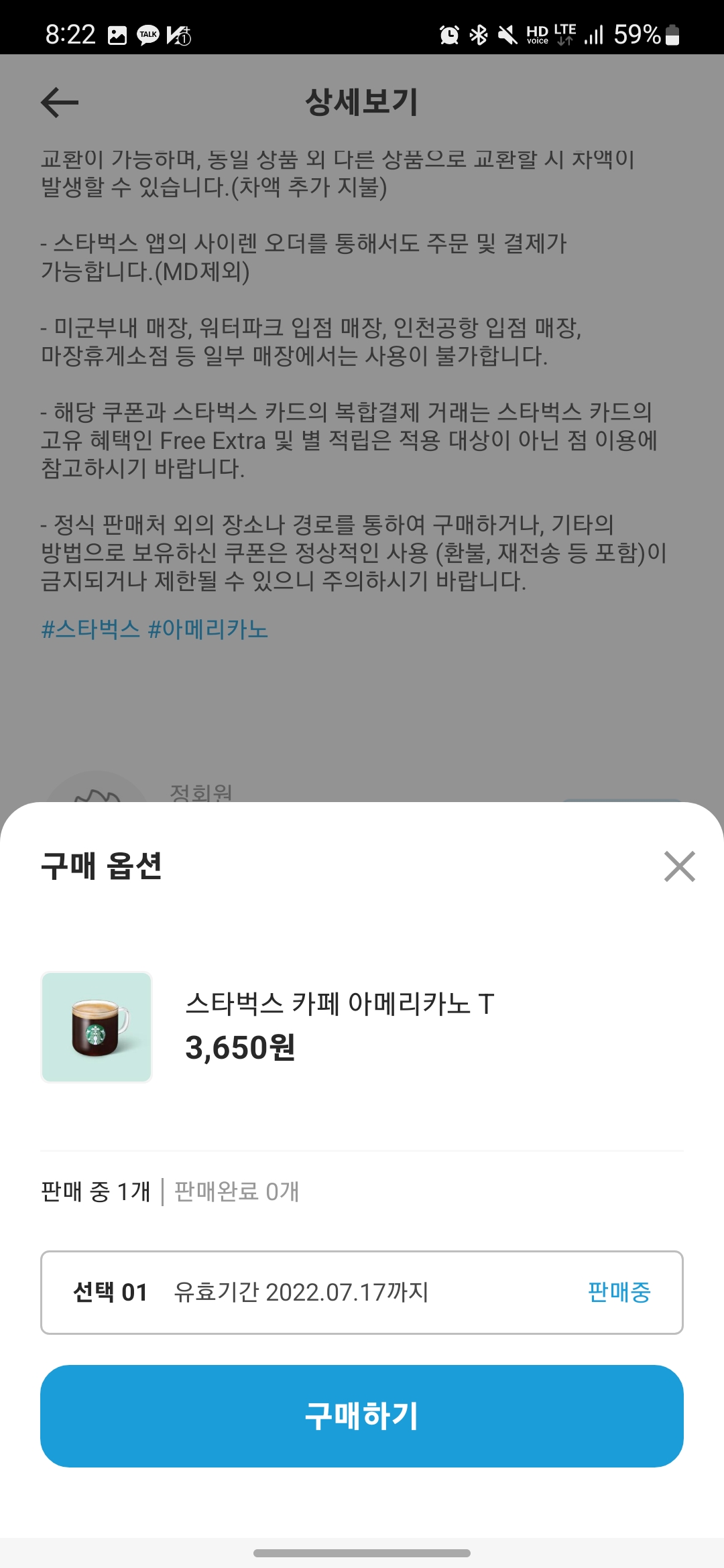 예시로 스타벅스 커피를 구매한다고 하면 아래와 같이 할인된 상품 금액과 상품 유효기간, 상품 설명까지 확인하실 수 있습니다.