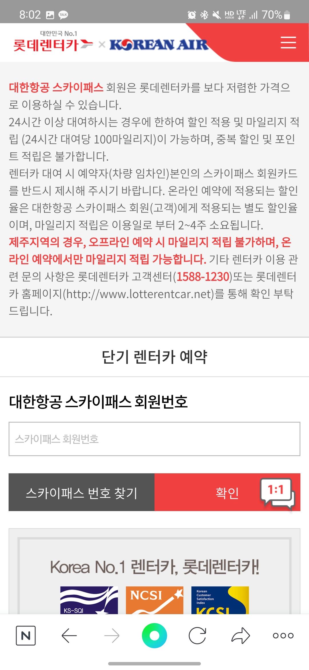 "대한항공 스카이패스 회원은 롯데 렌터카를 보다 저렴한 가격에 이용하실 수 있습니다."