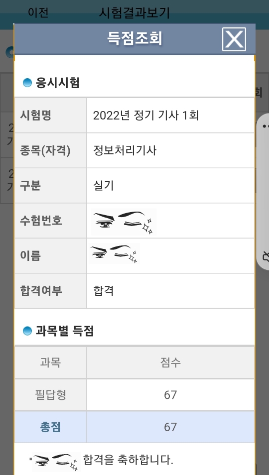 2022년도 정기 기사 1회 필기, 실기 합격 인증입니다. 위에서도 말씀드렸지만, 저는 고득점 합격이 아니라 실속형으로 자격증을 따기 때문에 본인이 자신 있고, 없는 과목을 잘 선별하셔서 득점률을 높여보세요ㅎㅎ