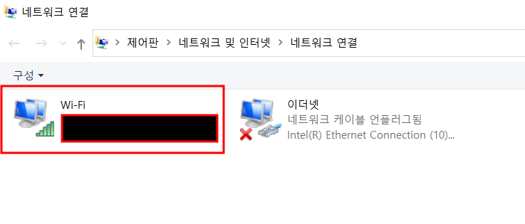 어댑터 옵션 변경을 누르면 네트워크 연결 창이 나타나고 구성 항목에서 Wi-Fi로 돼있는 네트워크를 선택해서 더블클릭해주시면 됩니다.