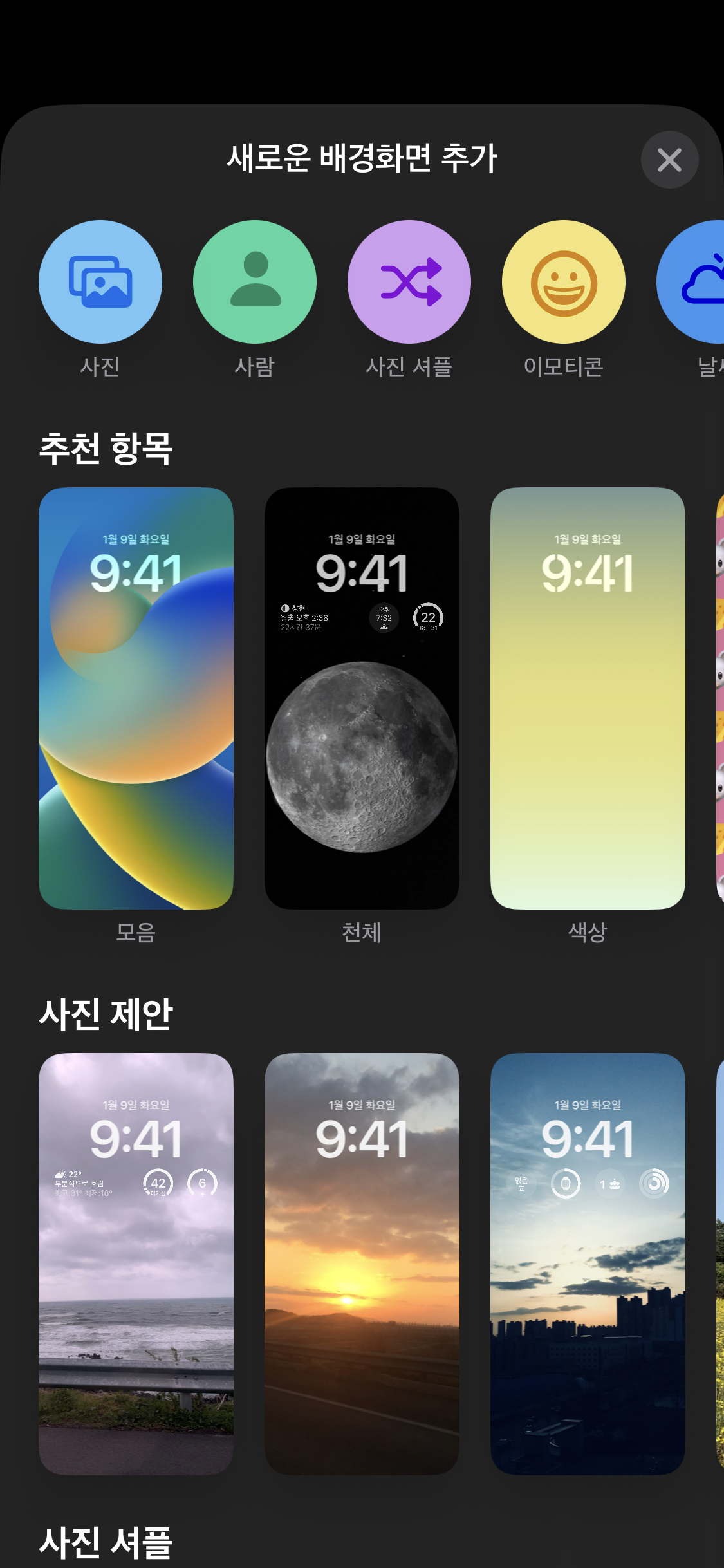 잠금화면(배경화면)으로 설정할 수 있는 기능으로는 사진(앨범), 사람, 사진 셔플, 이모티콘, 날씨, 천체, 색상이 있습니다.