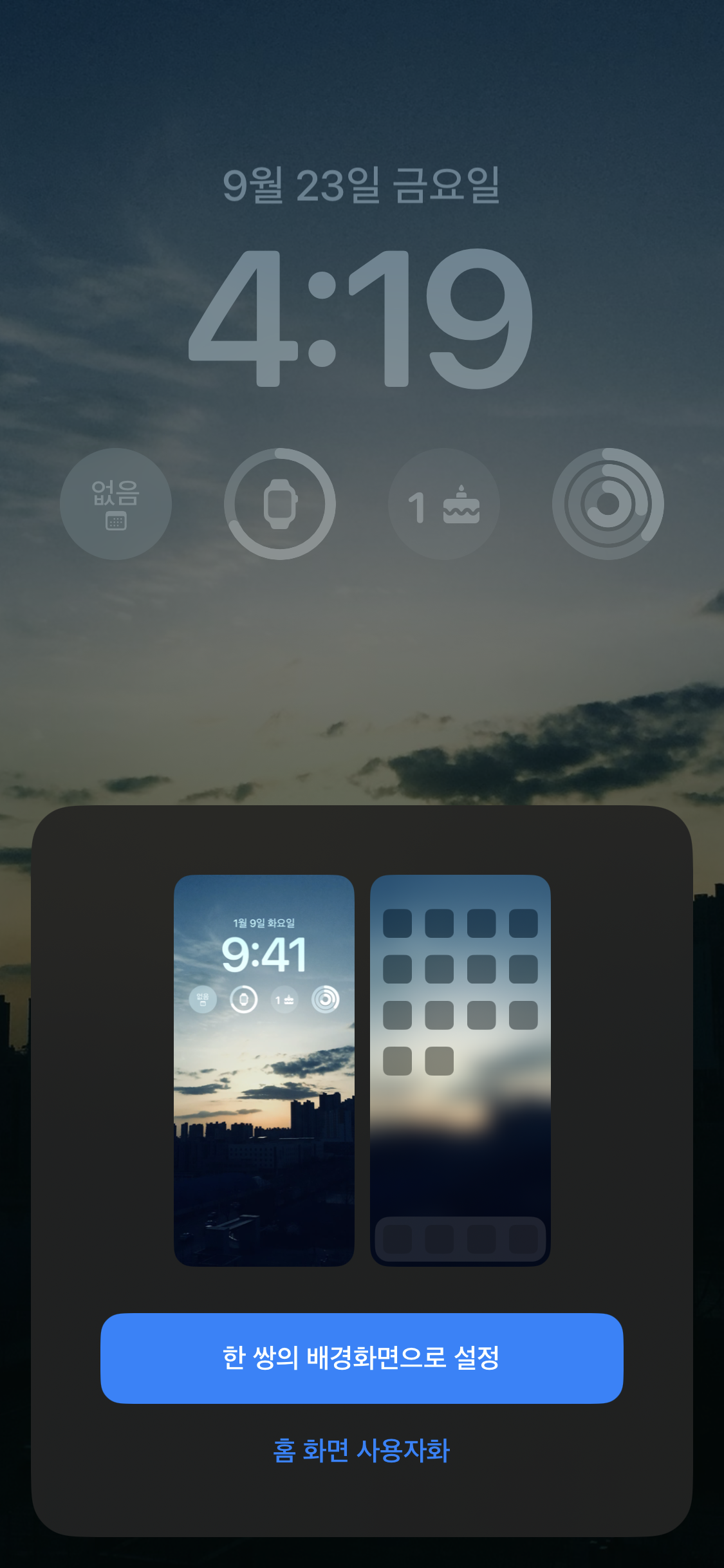 잠금화면 설정을 완료하고 우측 상단의 추가 버튼을 누르면 잠금화면뿐만 아니라 홈 배경화면도 같이 변경할 건지 물어보는 메시지가 나옵니다. 여기서 홈 화면도 변경하고 싶다면 홈 화면 사용자화 버튼을 누르면 됩니다.