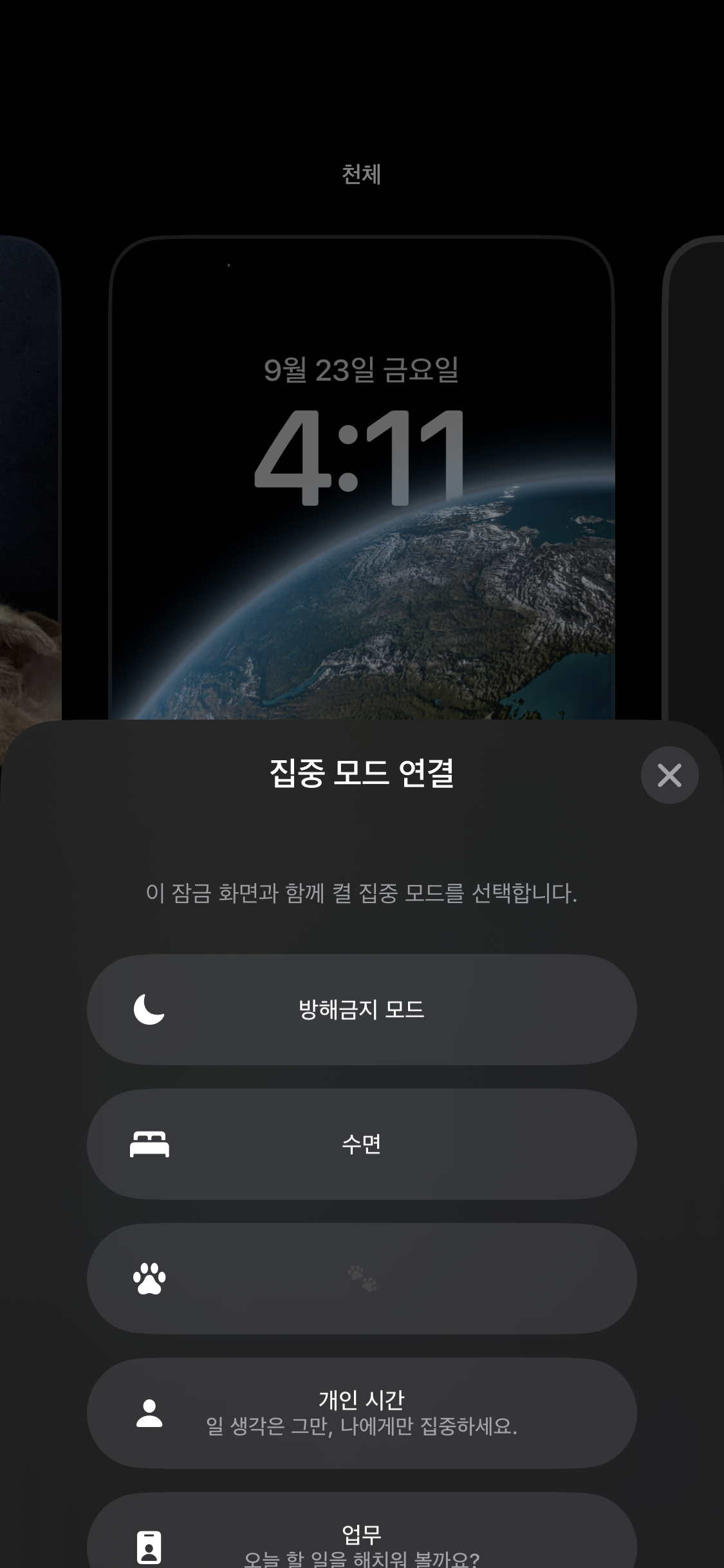 여기서 잠금화면에 맞는 집중모드를 선택해주면 해당 집중모드가 실행될 때 잠금화면(배경화면)이 변경됩니다.