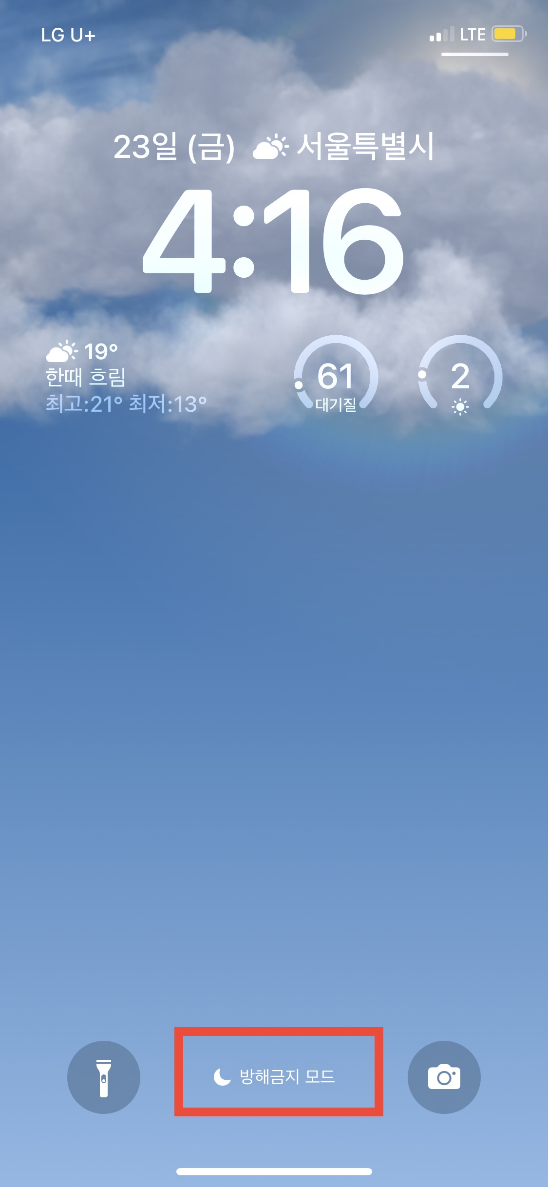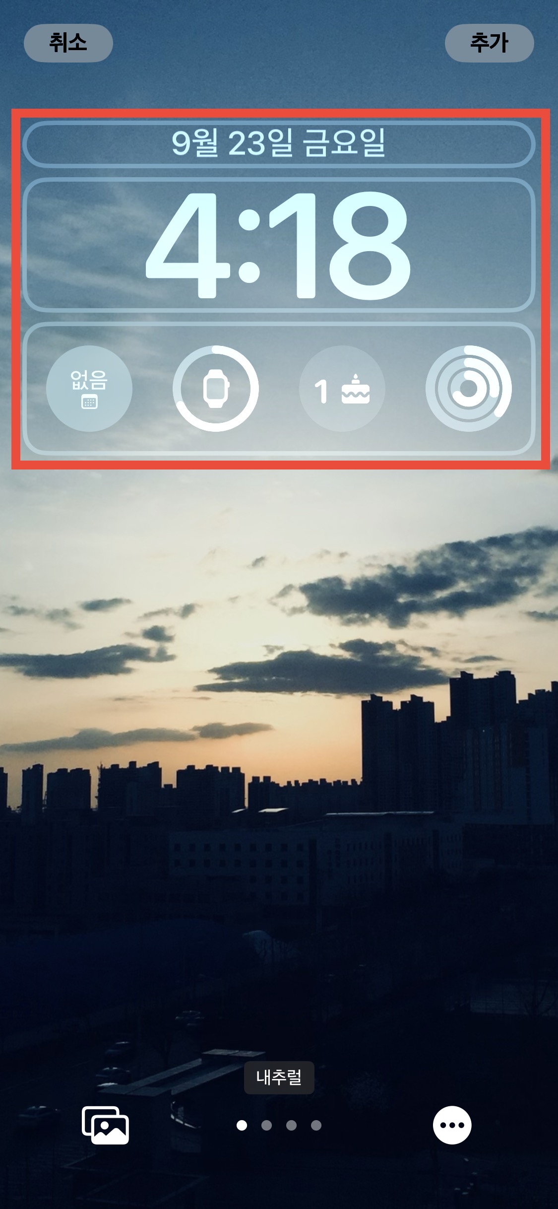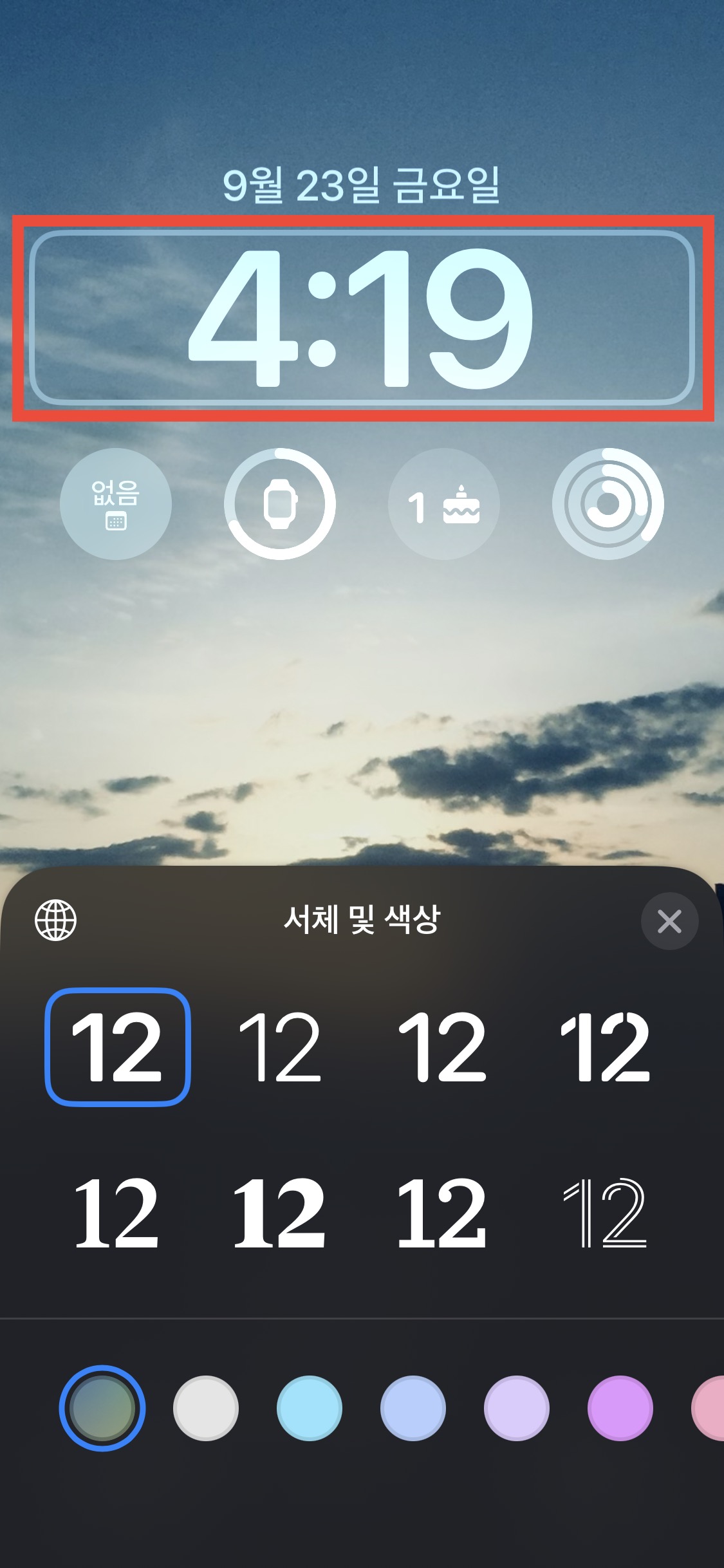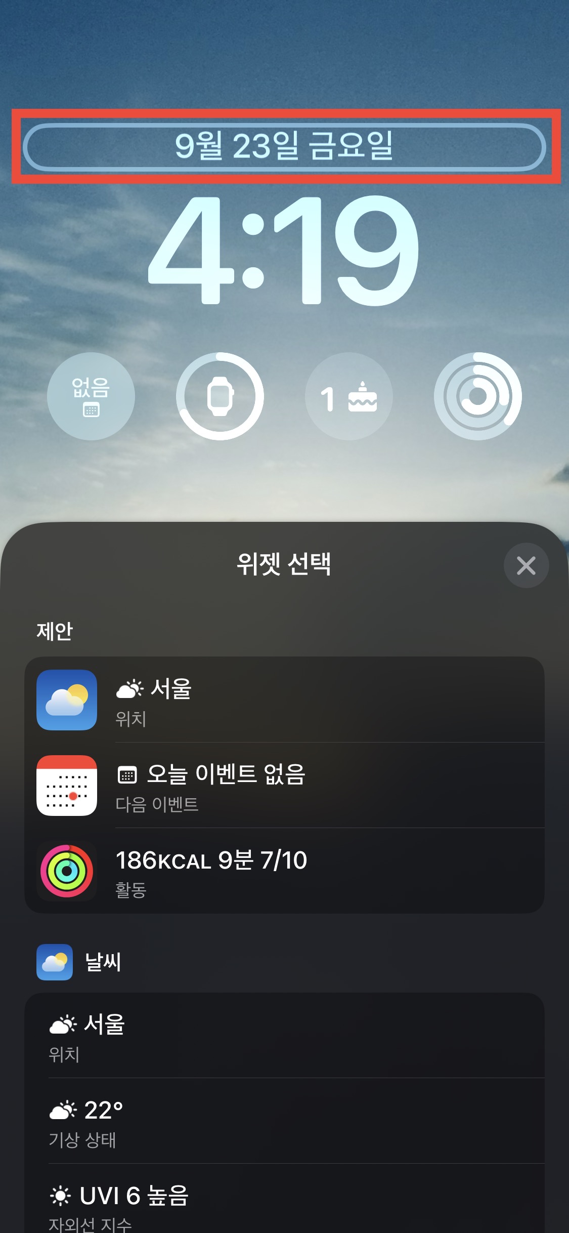 날짜 부분과 시계 아래에 있는 위젯 구역을 개인화할 수 있습니다.