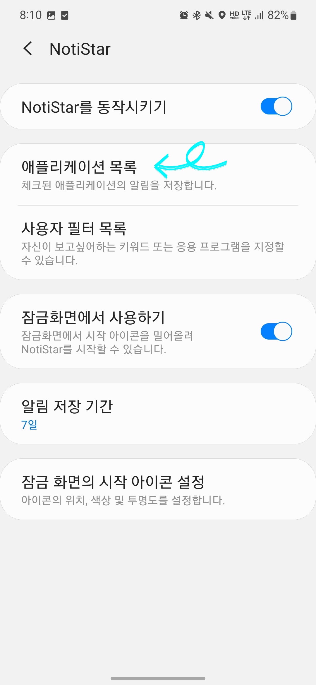 NotiStar를 동작시켜서 잠금 화면에서 알림 받을 애플리케이션 목록을 설정해주세요!