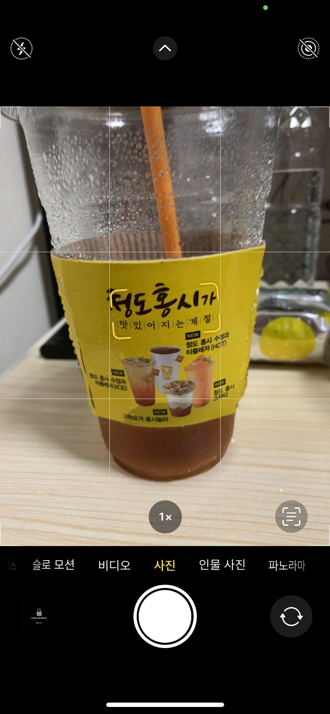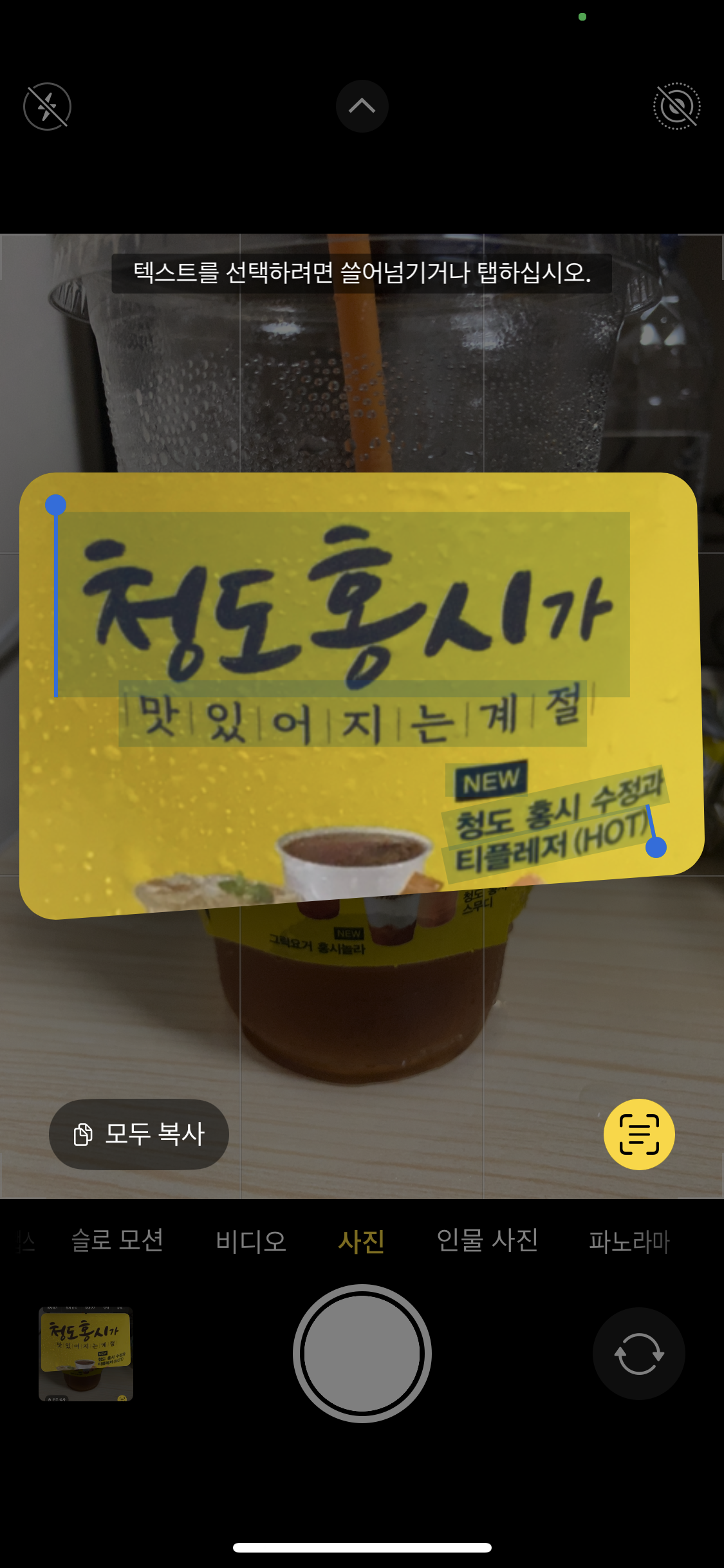 카메라 앱 실행 후 한글이 적혀있는 물체를 찍고 있으면 라이브 텍스트 기능이 활성화됩니다.