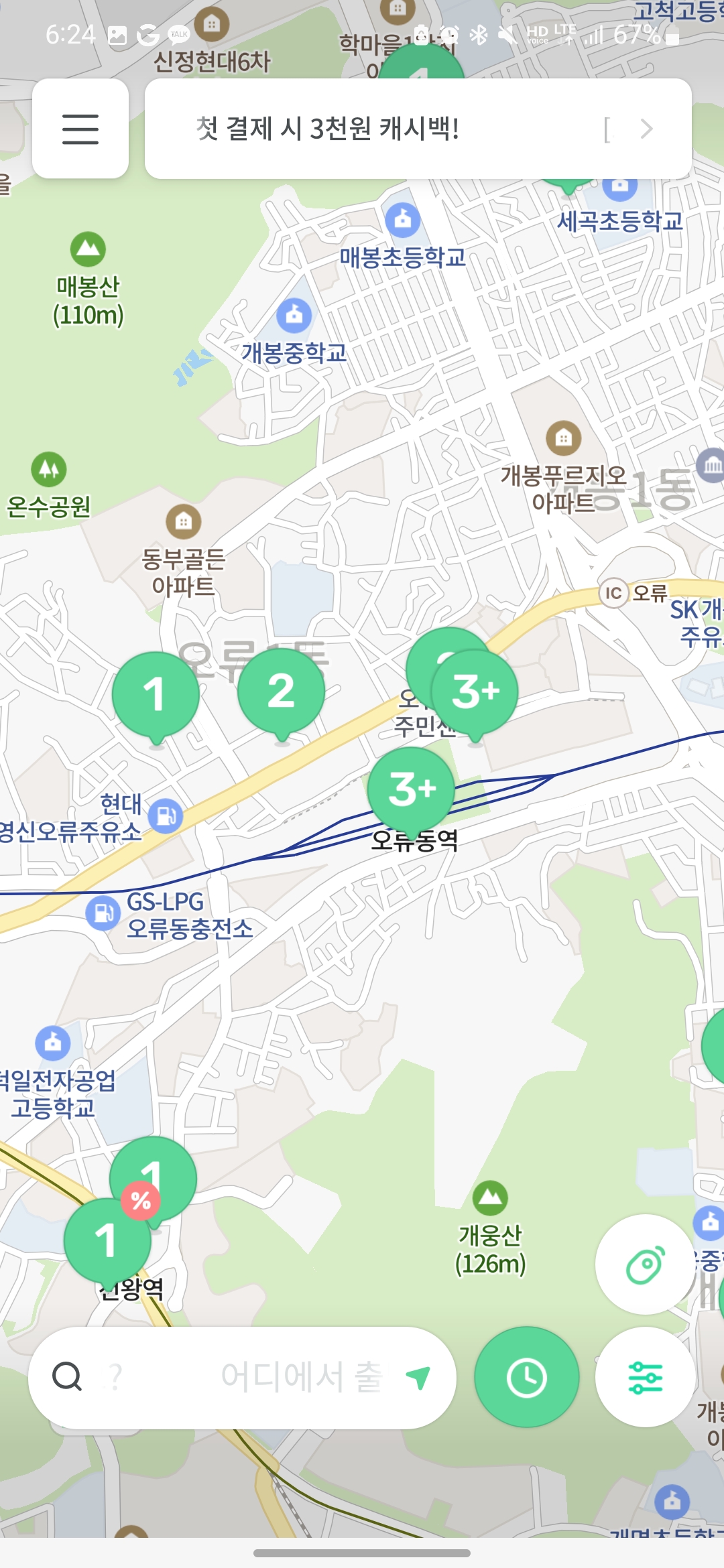 어플을 실행하면 현재 본인이 위치하고 있는 지도상 그린카 존이 표시되며, 숫자 표시를 누르면 대여 가능한 차들의 목록이 조회됩니다.