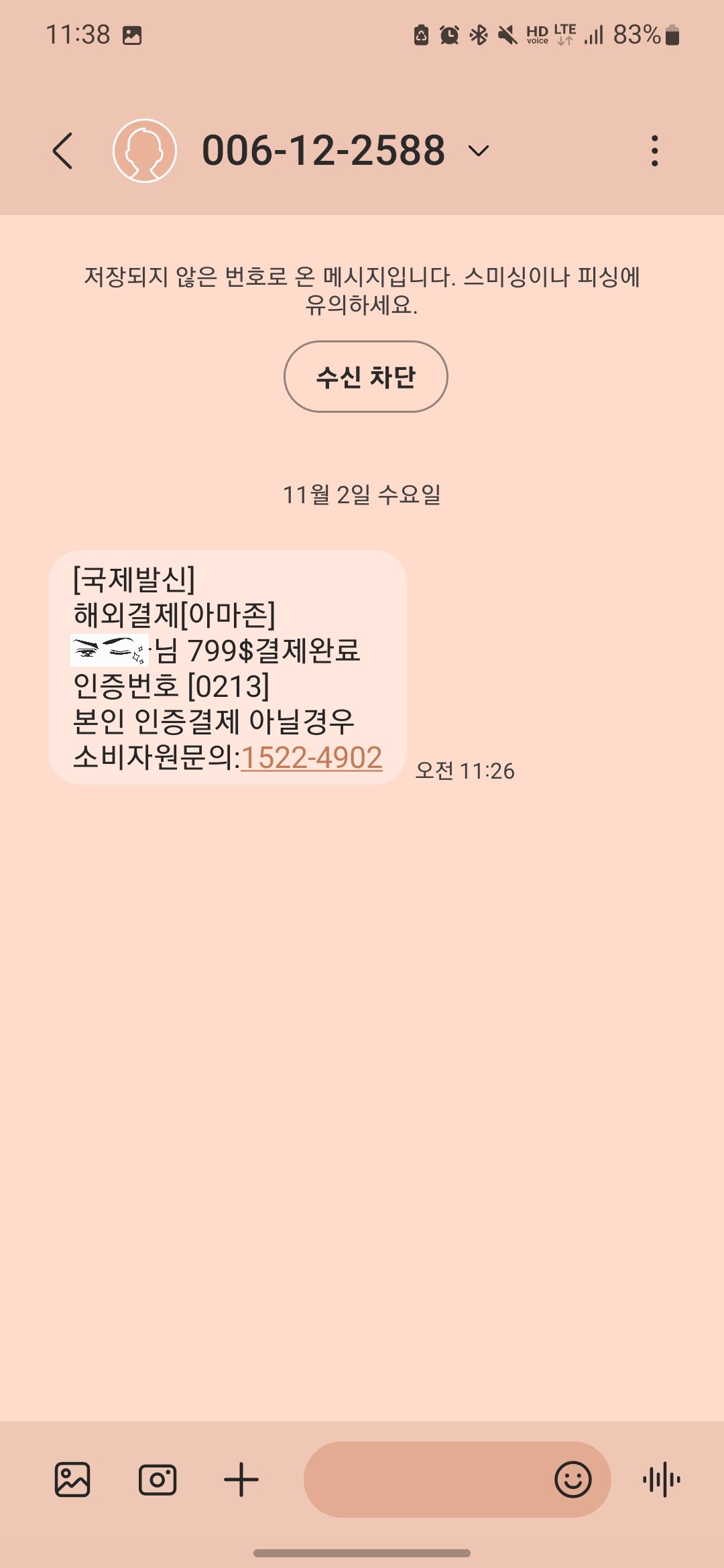 다음은 해외결제[아마존] 본인 이름 달러($) 인증번호로 실제 본인의 이름이 들어가서 놀래서 문자에 표시된 전화번호로 전화를 거시는 분들이 있을 겁니다.