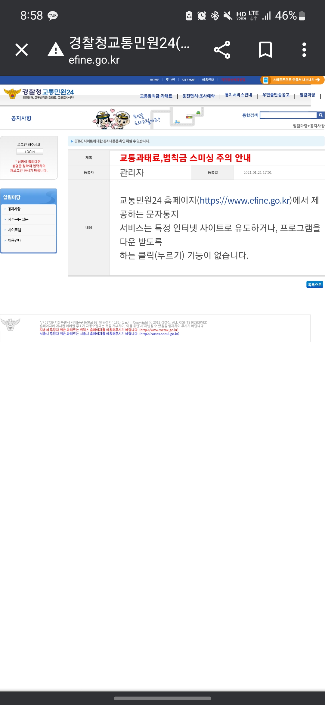 실제 경찰청교통민원24 사이트를 들어가 보더라도 해당 스미싱 문자가 사기인 것을 알 수 있으며, 교통민원24는 문자에 링크를 첨부하지 않는다는 것을 꼭 기억해주세요!