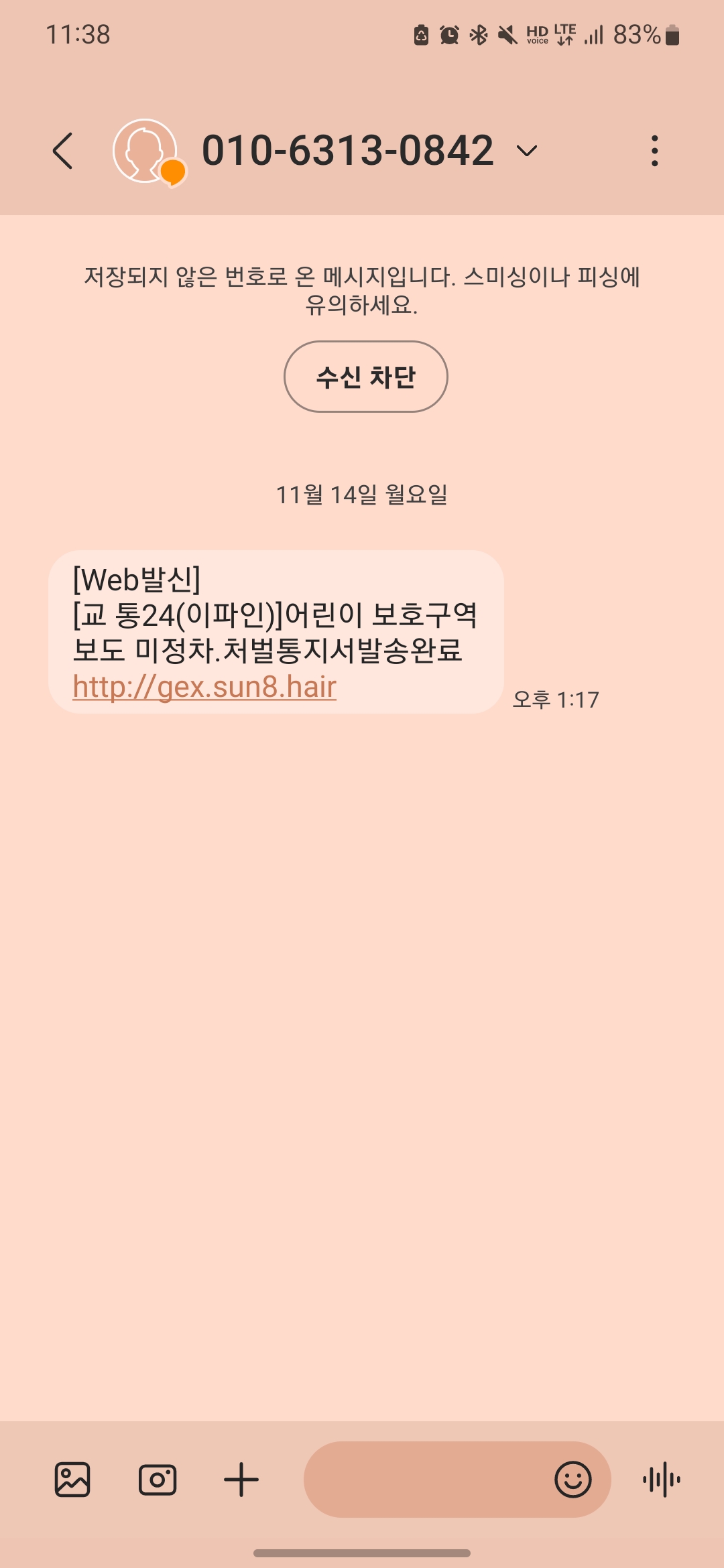 하나는 교통24 어린이 보호구역 보도 미정차 처벌통지서발송완료라는 문자가 전송되고 해당 내용을 확인할 수 있도록 링크를 걸어두는 것인데 절대로 누르시면 안됩니다!