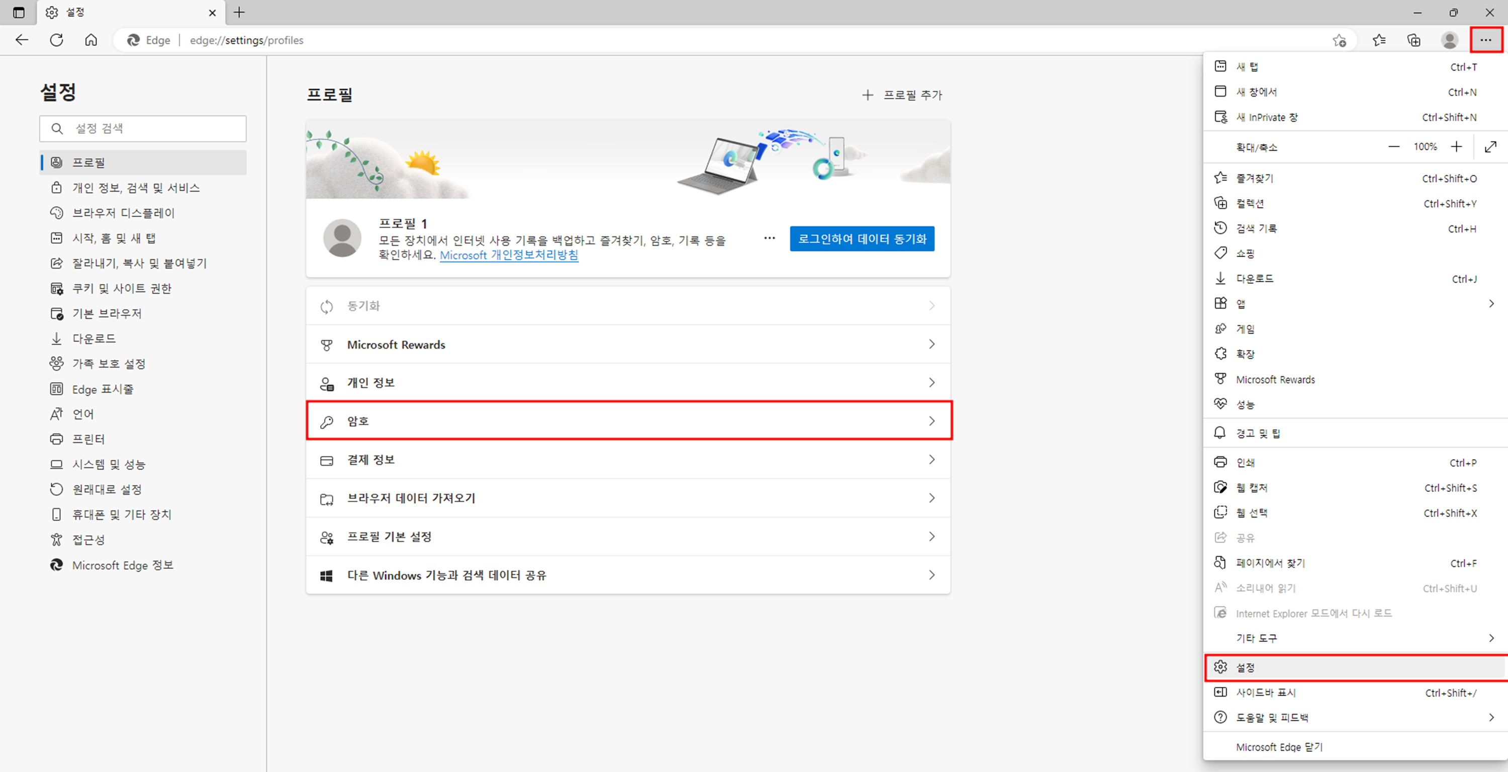만약 이미 저장돼있는 암호가 존재하지 않는다면 브라우저 실행 후 우측 상단 ...모양의 버튼을 눌러서 설정 항목을 선택해주시고 왼쪽 설정 탭에서 프로필 선택 후 암호를 눌러주세요!