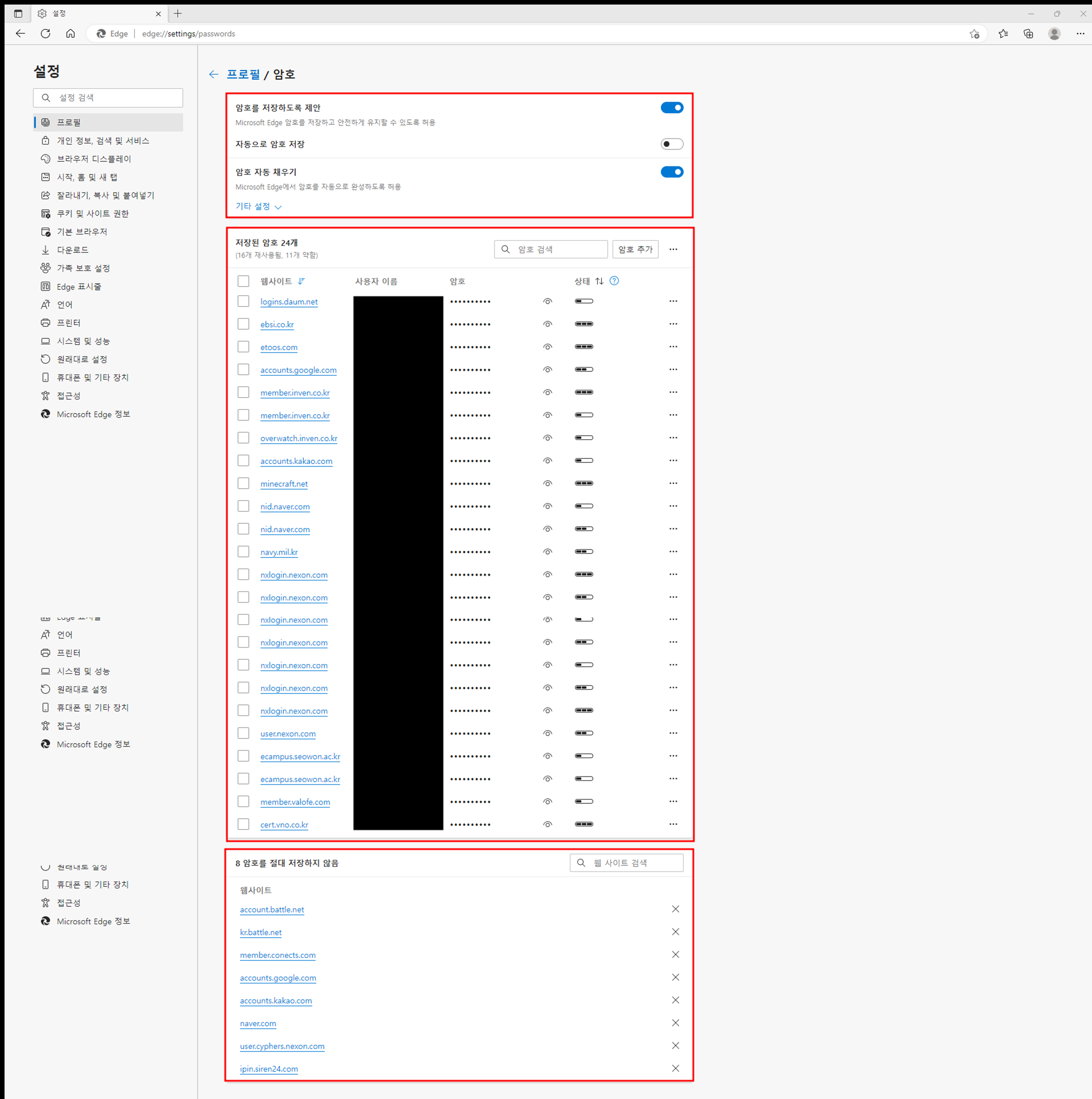 엣지 브라우저를 실행시켜서 네이버나 다음 등 많은 곳에서 로그인을 시도하는데 이때 아래 캡처 사진과 같이 암호 관리라는 항목을 보실 수 있습니다!