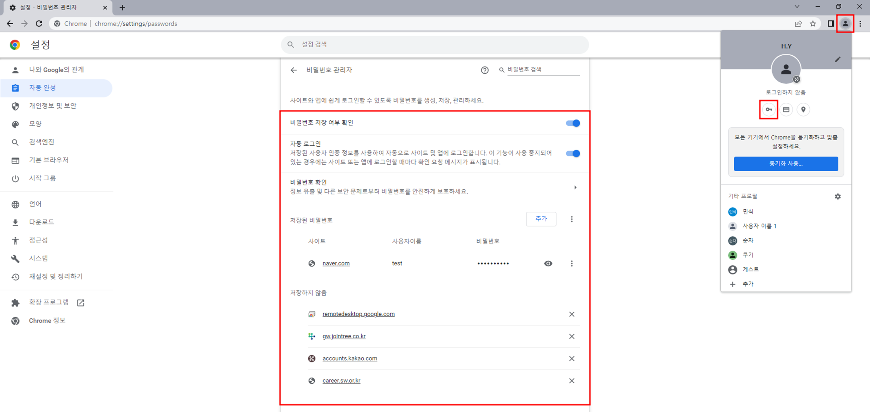 비밀번호 저장 여부 확인, 자동 로그인 항목을 설정할 수 있고 사이트에 저장된 비밀번호를 확인할 수 있습니다.