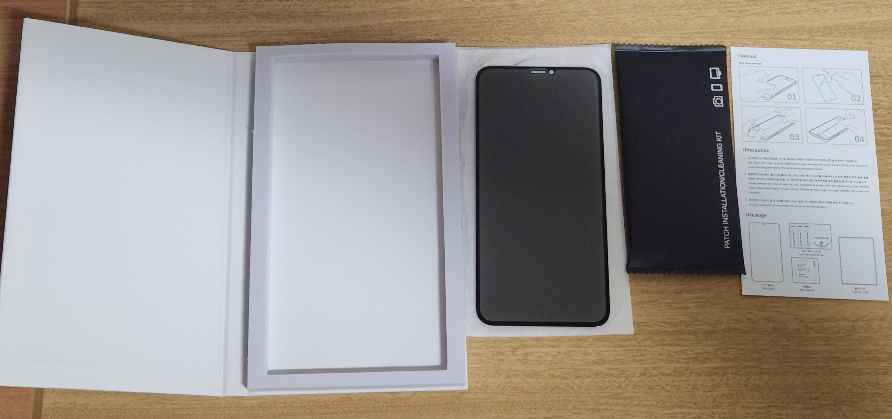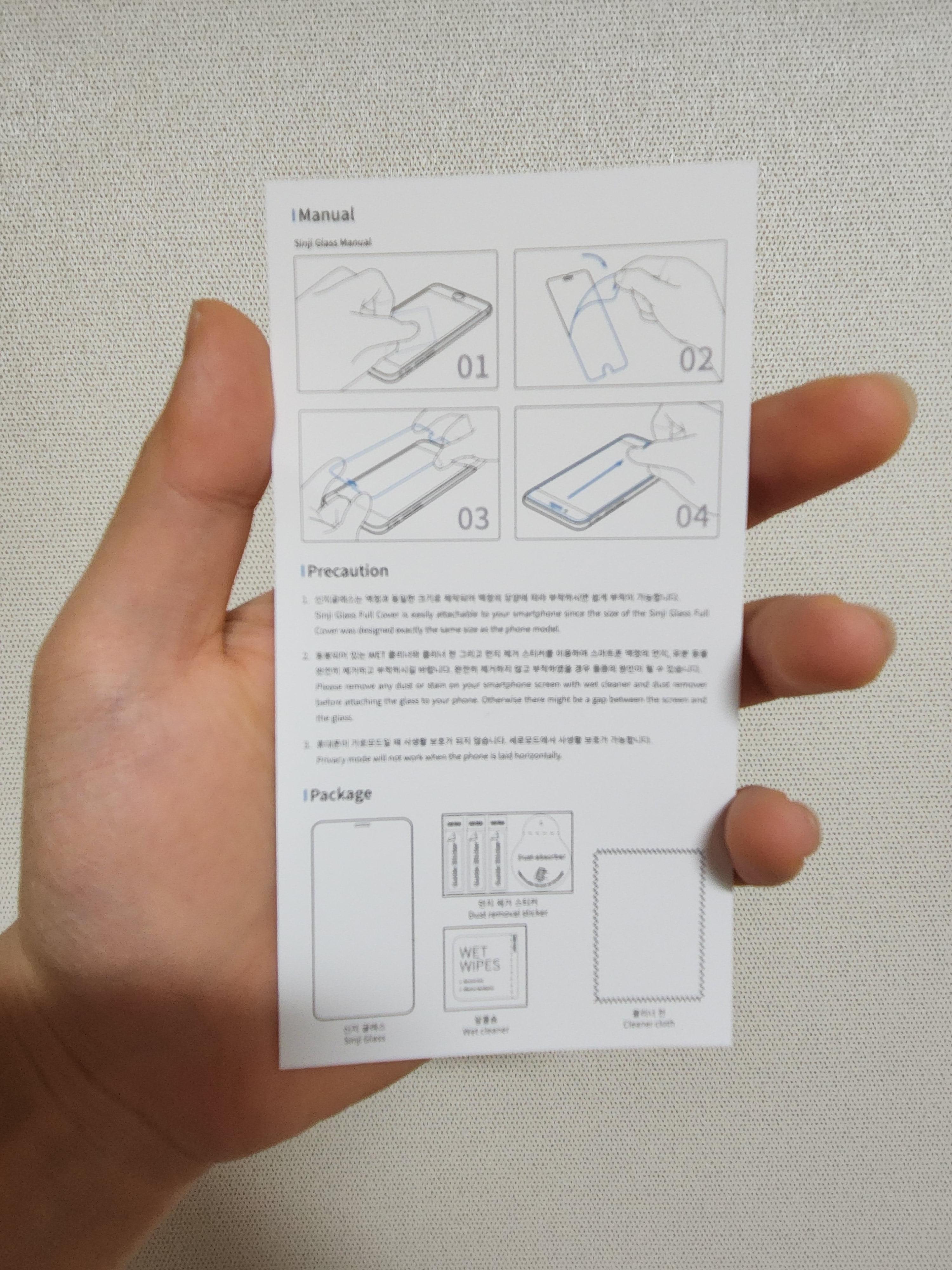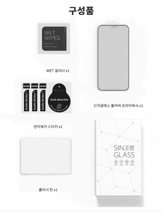 구성품으로는 WET 클리너, 먼지제거 스티커, 클리너 천, 신지글래스 풀커버 프라이버시, 필름 부착 설명서로 구성되어 있습니다. 필름이 한 개 밖에 없어서 붙이실 때 신중하셔야 합니다 ㅎㅎ..