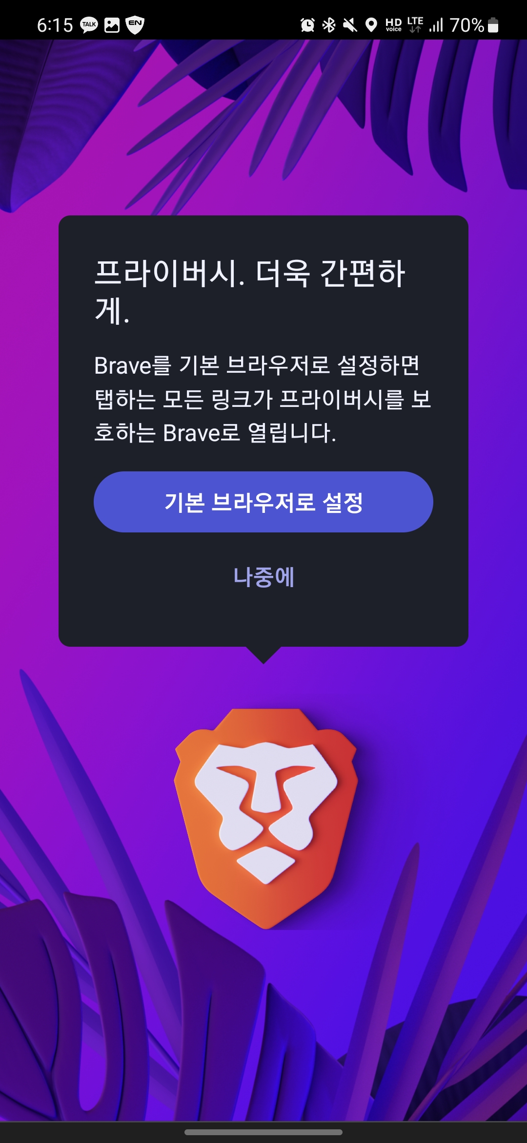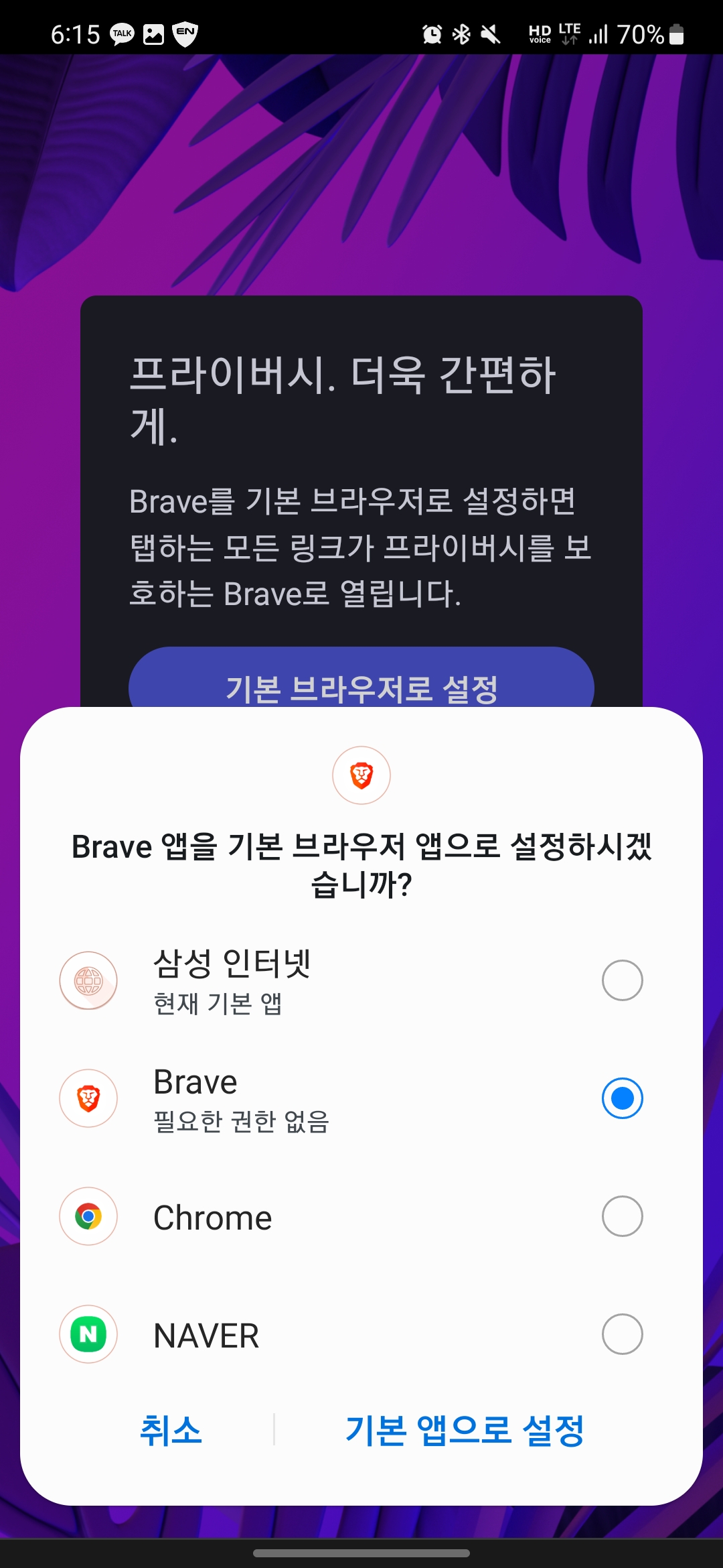 기본 브라우저 설정 시 Brave 앱을 선택 후 기본 앱으로 설정 버튼을 눌러주세요!