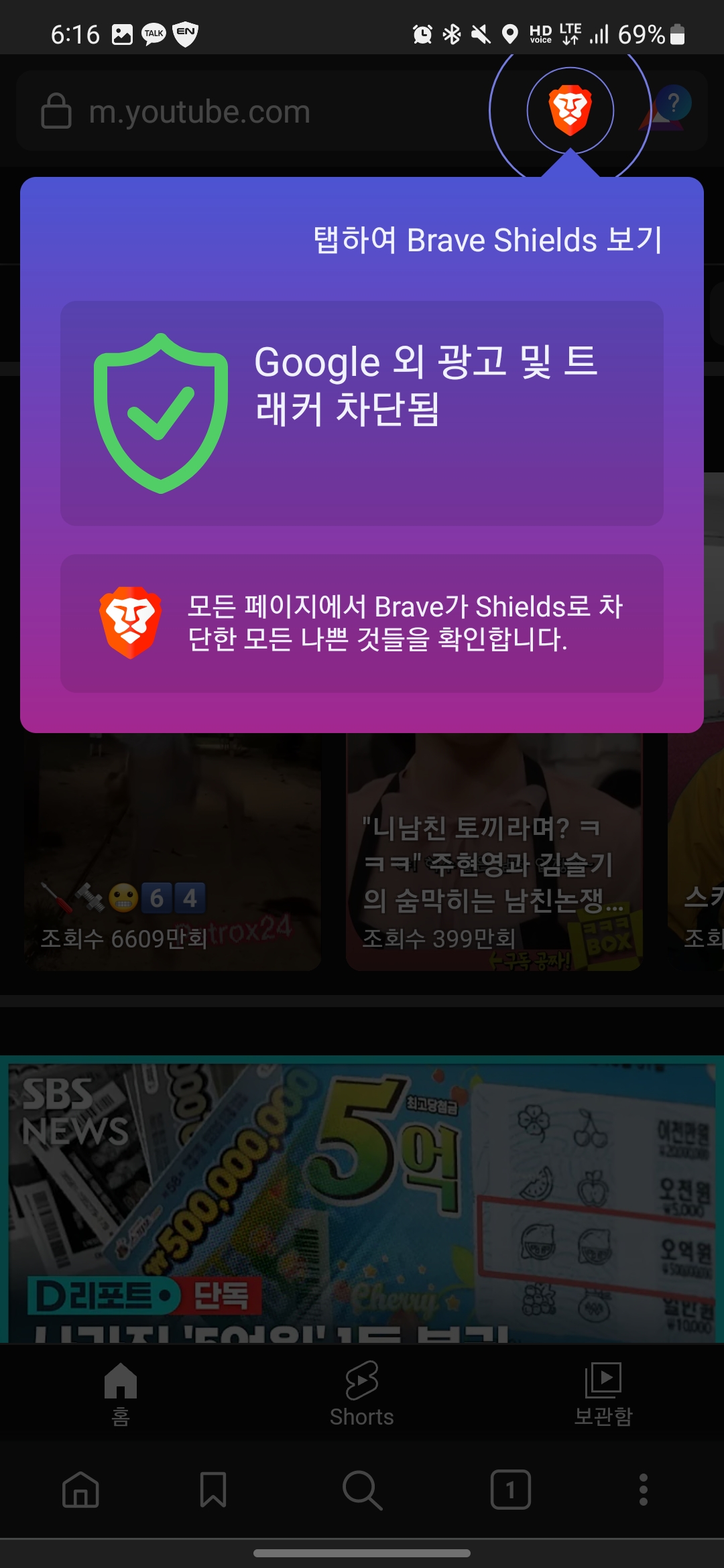 유튜브에 접속하면 아래 사진처럼 Brave 앱 브라우저에서 자동으로 Google 외 광고 및 트래커 차단됨이라는 문구가 나타나며, 이후 시청하시는 모든 영상에서 광고가 보이지 않는 경험을 하실 수 있습니다!