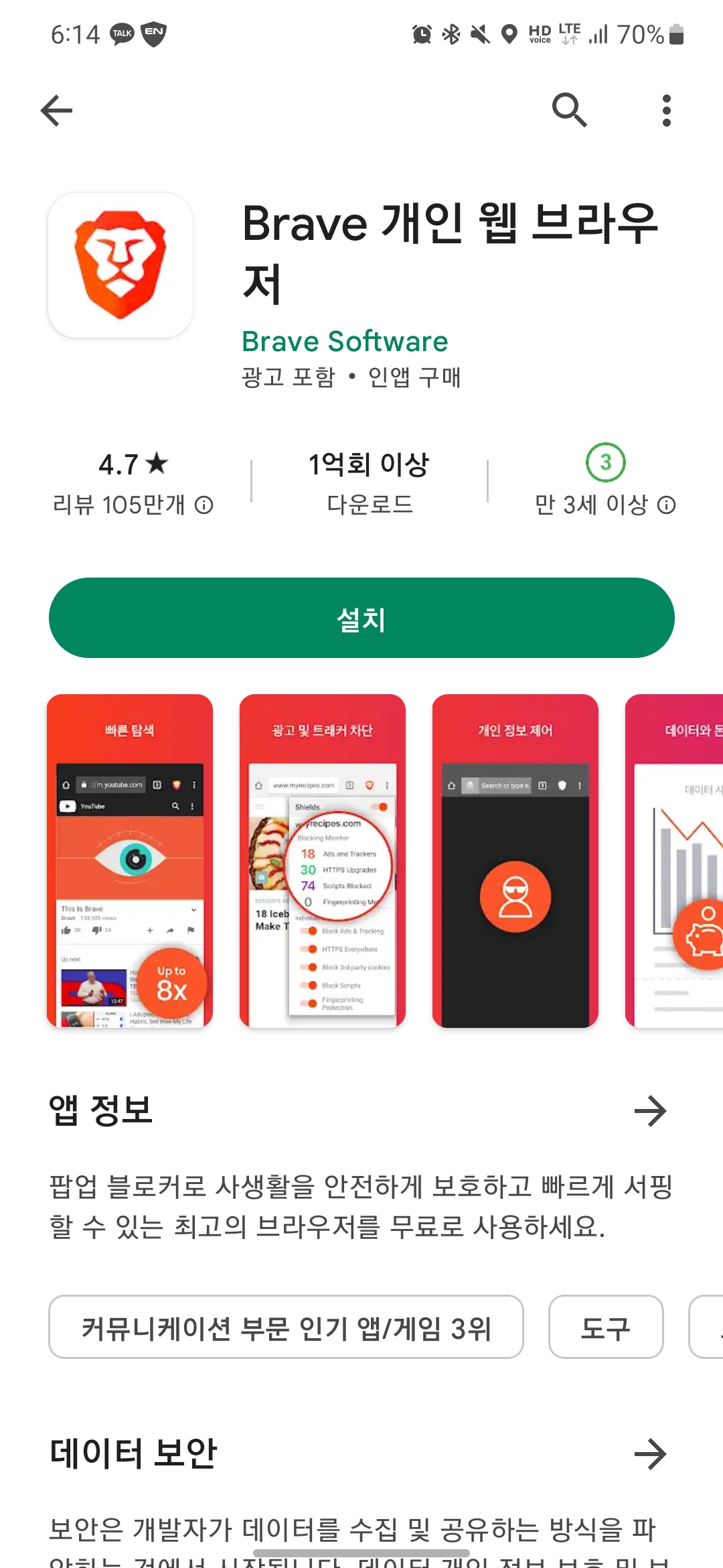 먼저 구글플레이스토어에서 Brave 앱을 설치해 주세요.