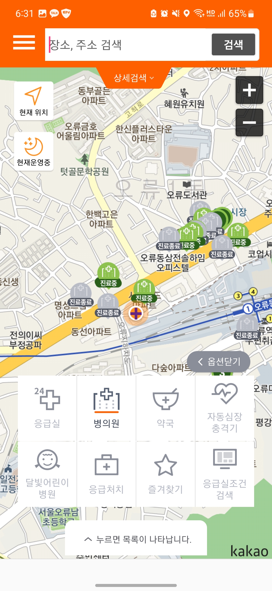 어플을 실행시키면 현재 본인 위치정보를 기반으로 응급실, 병의원, 약국 정보를 확인할 수 있습니다.