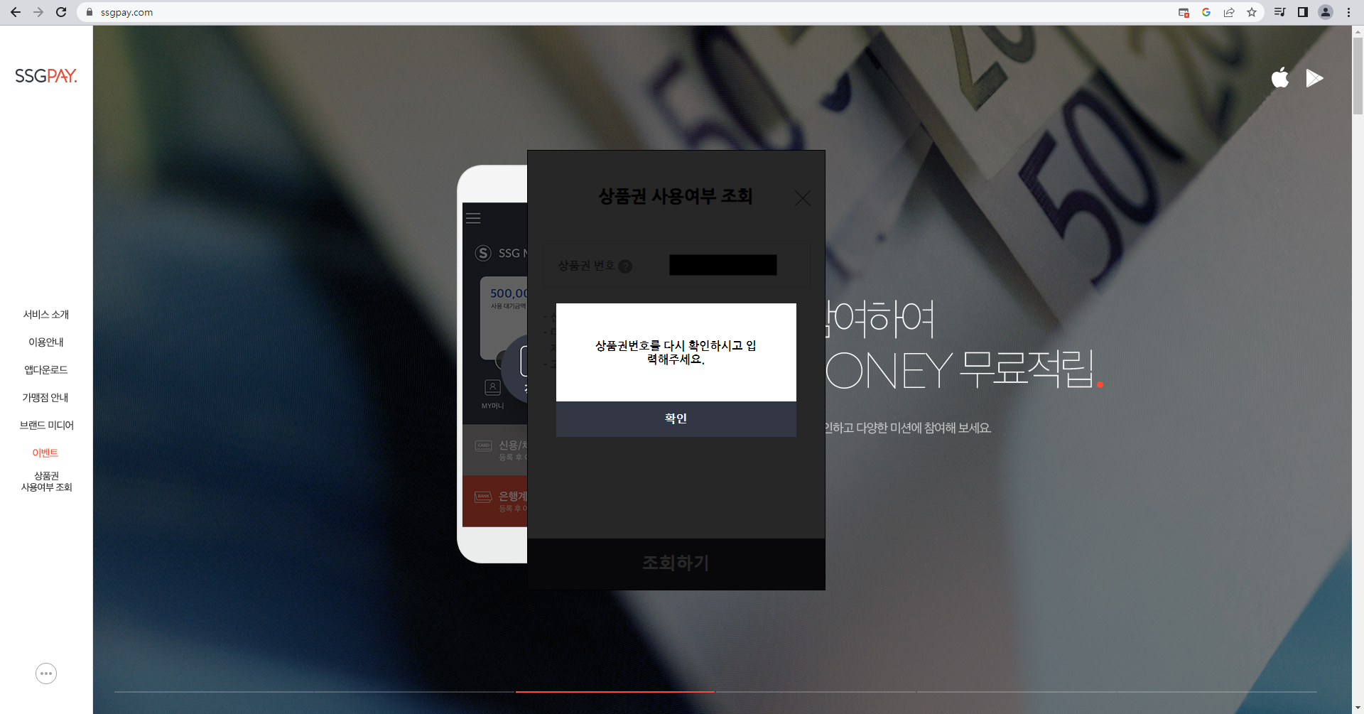 4단계 : 반대로 잘못된 상품권 번호를 입력하였을 경우 '상품권번호를 다시 확인하시고 입력해 주세요.'라는 문구가 출력됩니다.