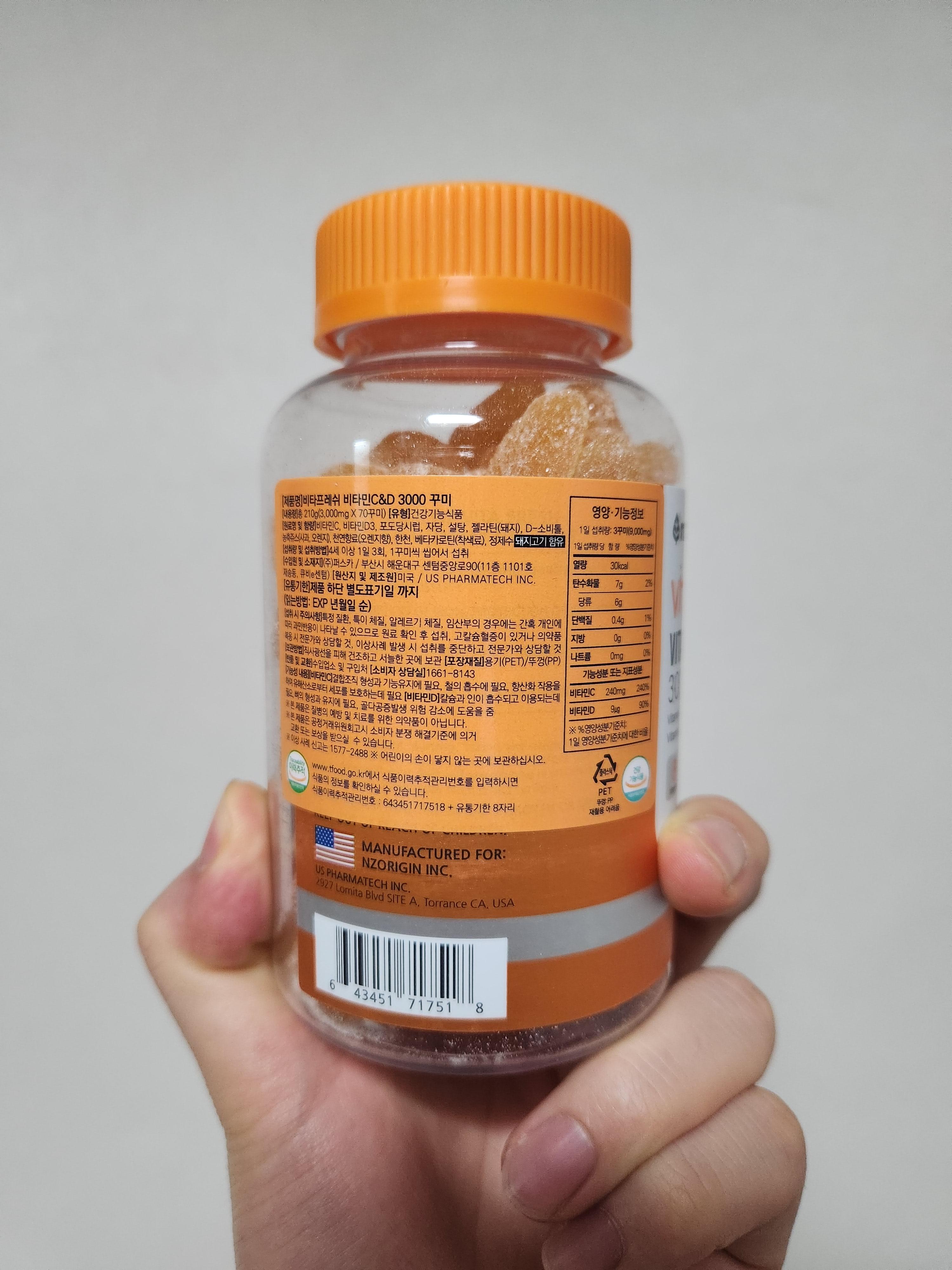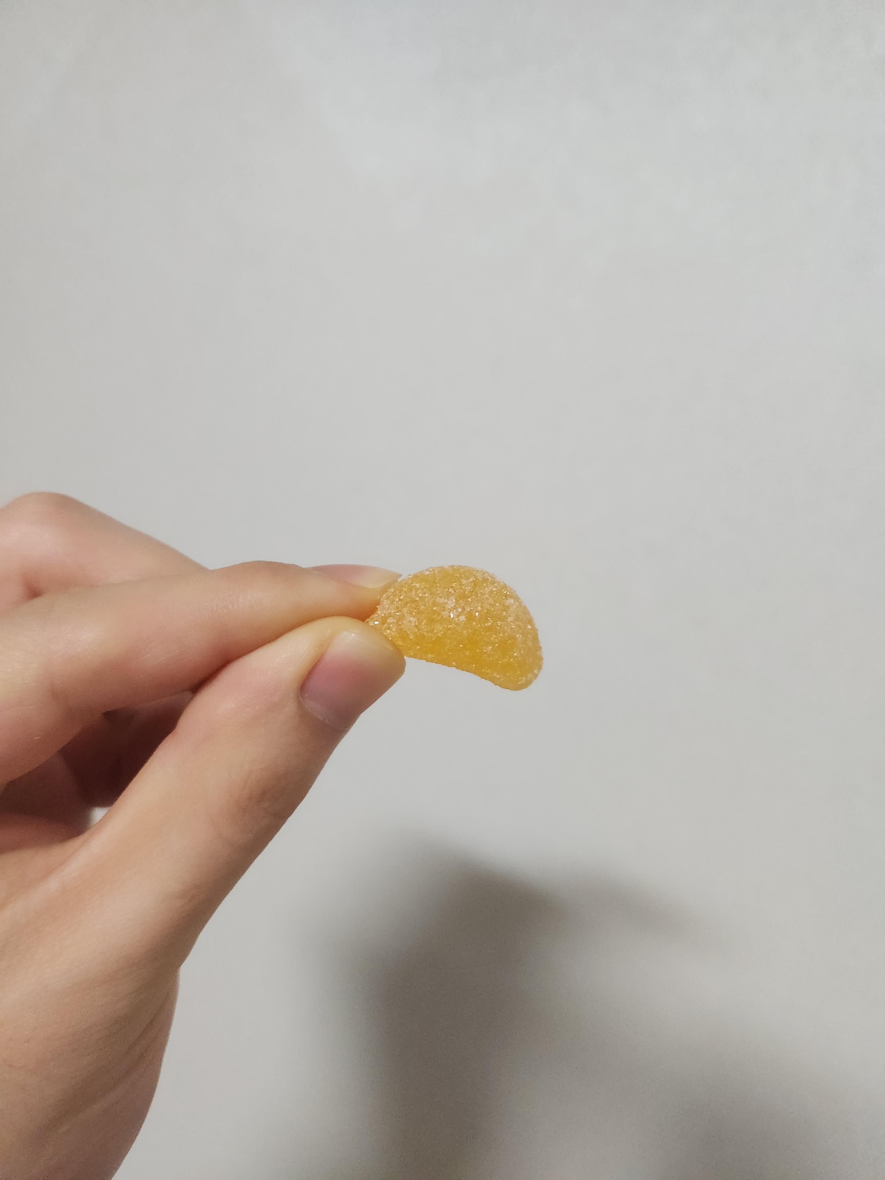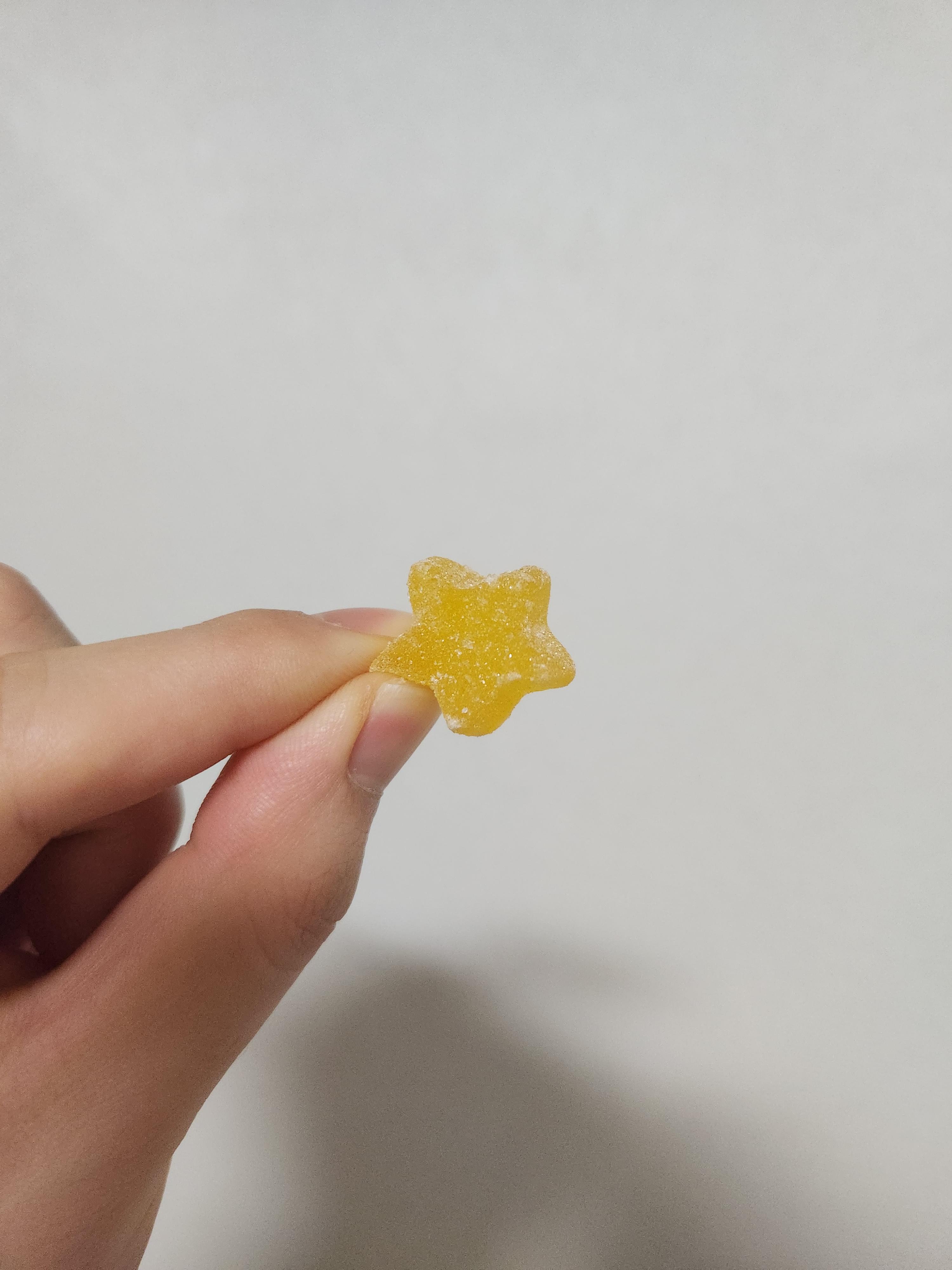 양이 꽤 많이 들어있어요~ 맛은 귤 맛 그대로 맛있었으며, 하루에 3~4개가 권장 섭취량이라고 합니다! 그리고 젤리에 설탕? 같은 가루가 붙어있어서 약간 끈적끈적합니다.