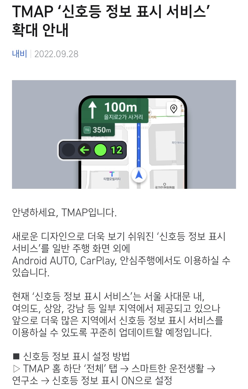 티맵에서 업데이트 소식을 한눈에 볼 수 있도록 캡처본을 가져와봤구요,, 현재 신호등 정보 표시 서비스는 서울 일부 지역만 적용된 상태이고 점차 서비스 지역을 넓혀가고 있다는 점 참고하시길 바랍니다!