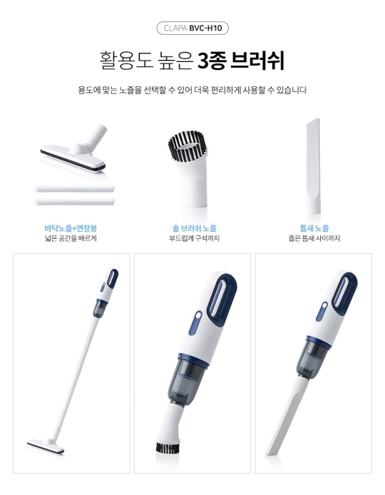 큰 가정집에서 사용하기엔 시간도 오래 걸리고 성능 차이가 크겠지만, 원룸 및 간편한 청소를 원하신다면 클래파 DC모터 다용도 미니 핸디형 무선청소기 BVC-H10를 추천드립니다~