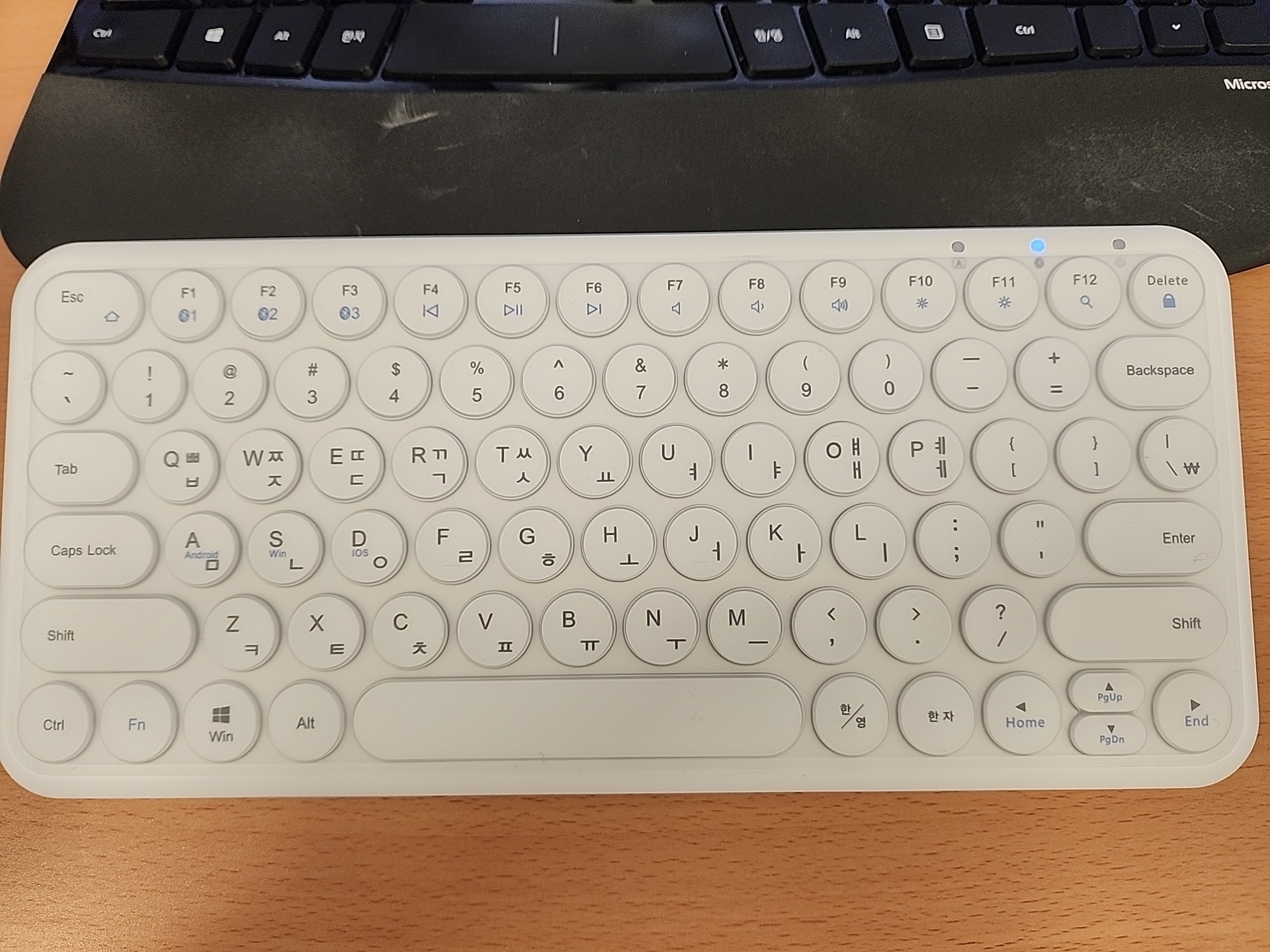 키보드 블루투스 연결의 경우 Fn + F1, F2, F3 세 개의 키 중 하나를 눌러서 페어링 모드로 전환 후 키보드 우측에 나타나는 파란 불빛을 확인 후 연결하시면 됩니다!