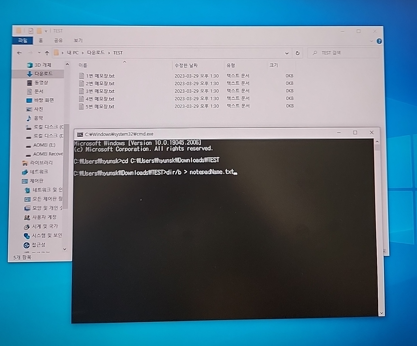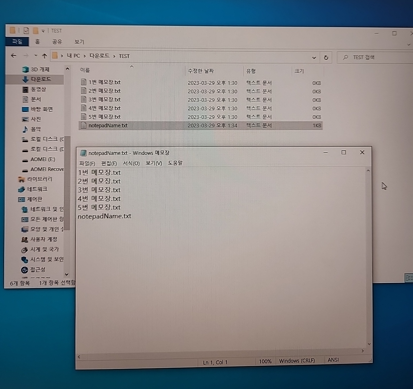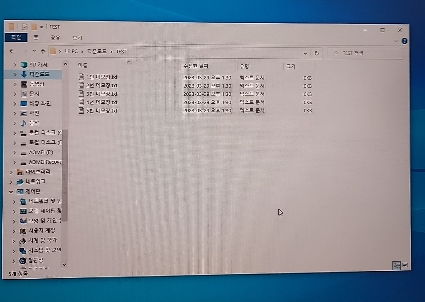 먼저 임시로 사용할 TEST 폴더를 만든 후 5개의 메모장 파일을 만들어보겠습니다.