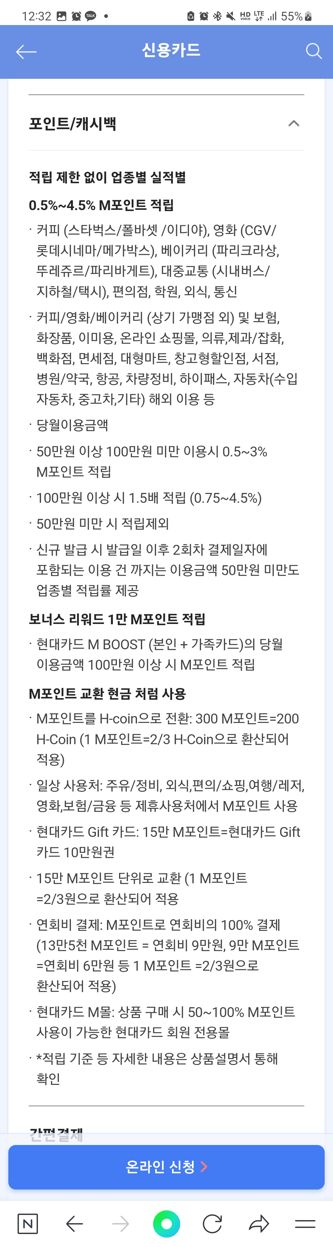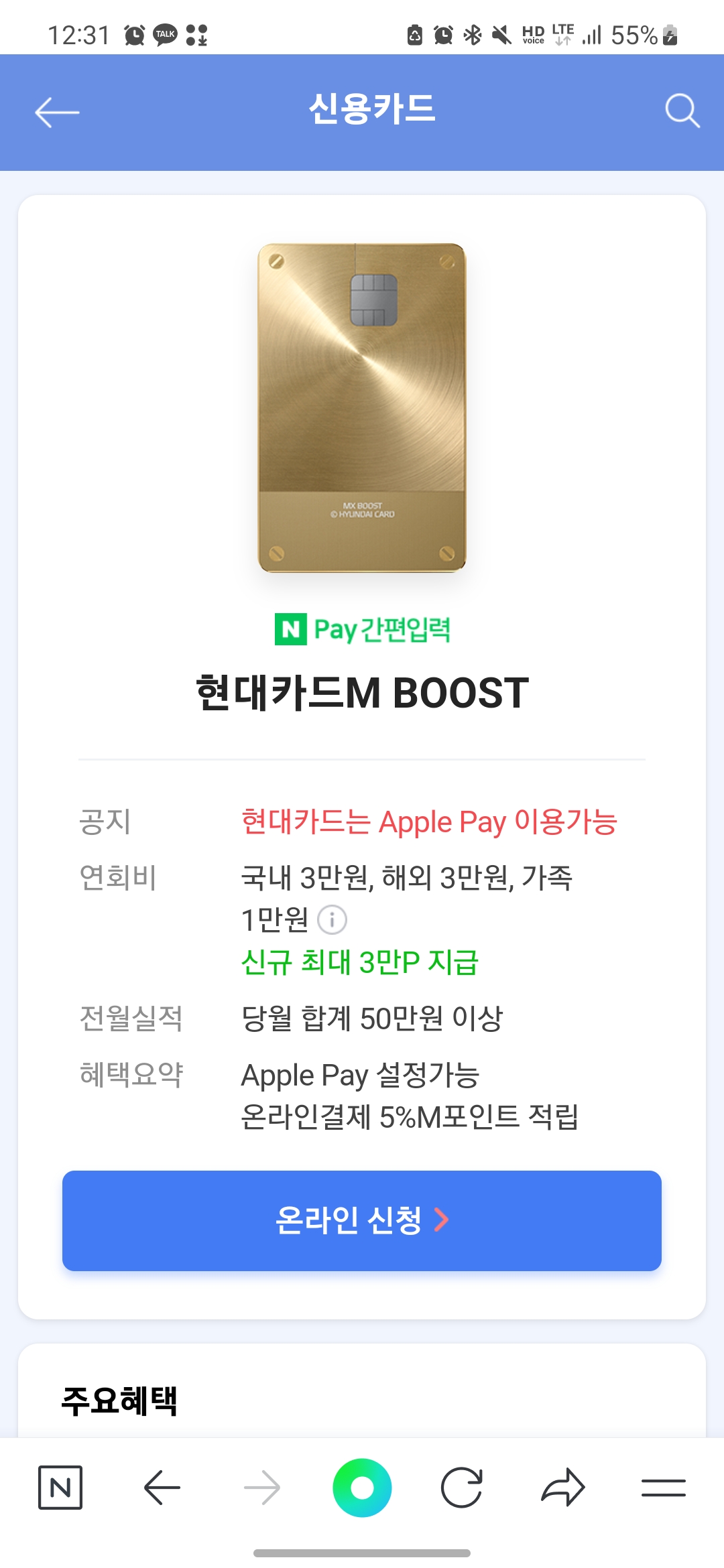 그리고 요즘 애플페이가 활성화되면서 현대카드를 많이 발급받으실 거라고 생각이 드는데 현대카드 M BOOST도 발급받으시면 애플페이로도 활용이 가능해서 일석이조가 될 거라고 생각이 듭니다!