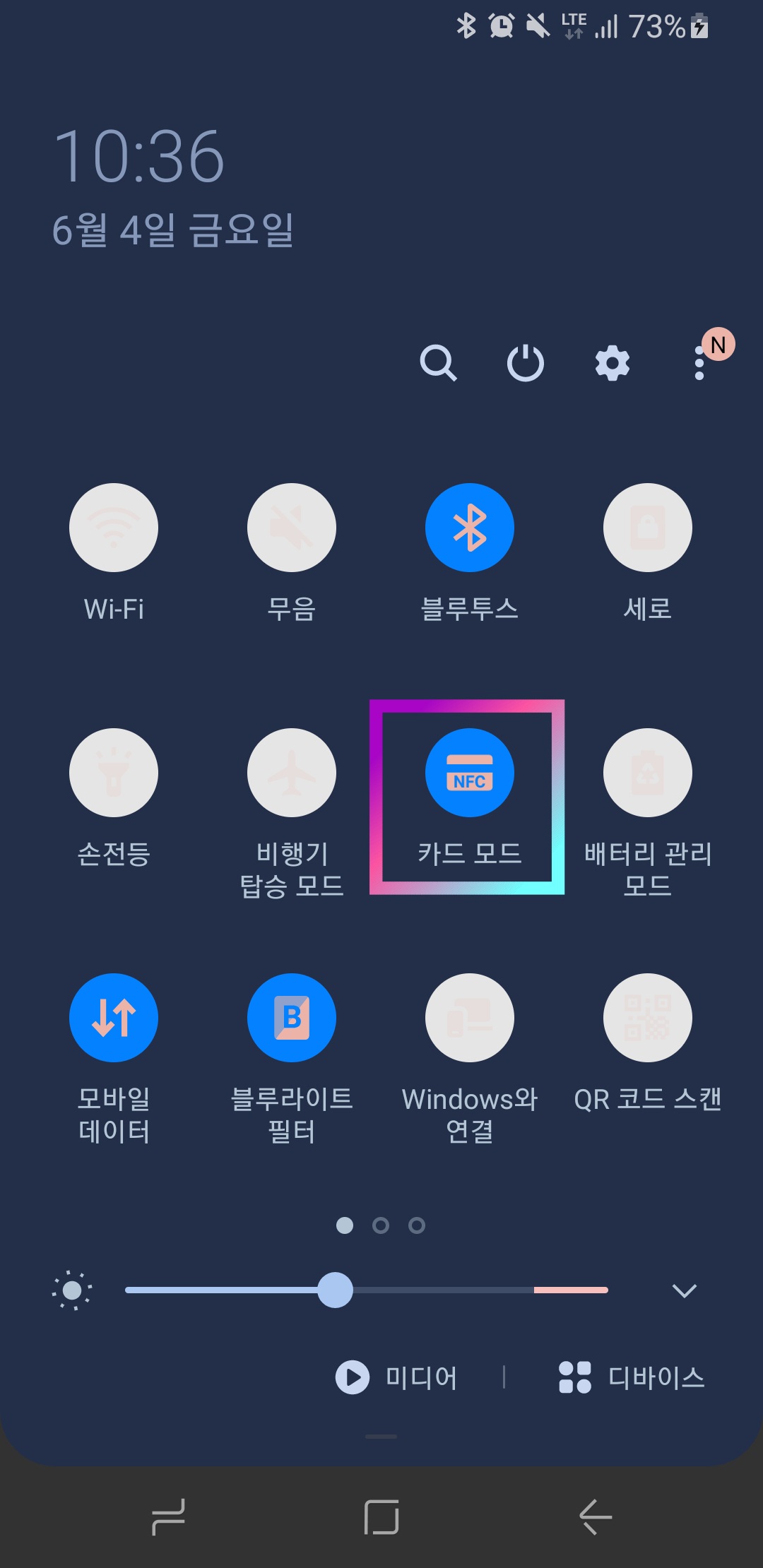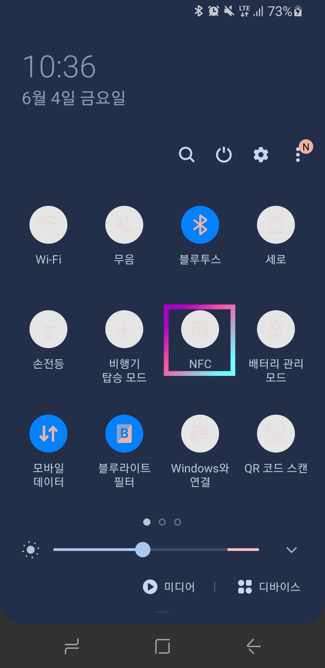 1. 후불교통카드 등록 후 핸드폰으로 사용하기 위해서 핸드폰 상단 메뉴탭을 내린 후에 NFC를 실행시켜 주셔야 합니다.