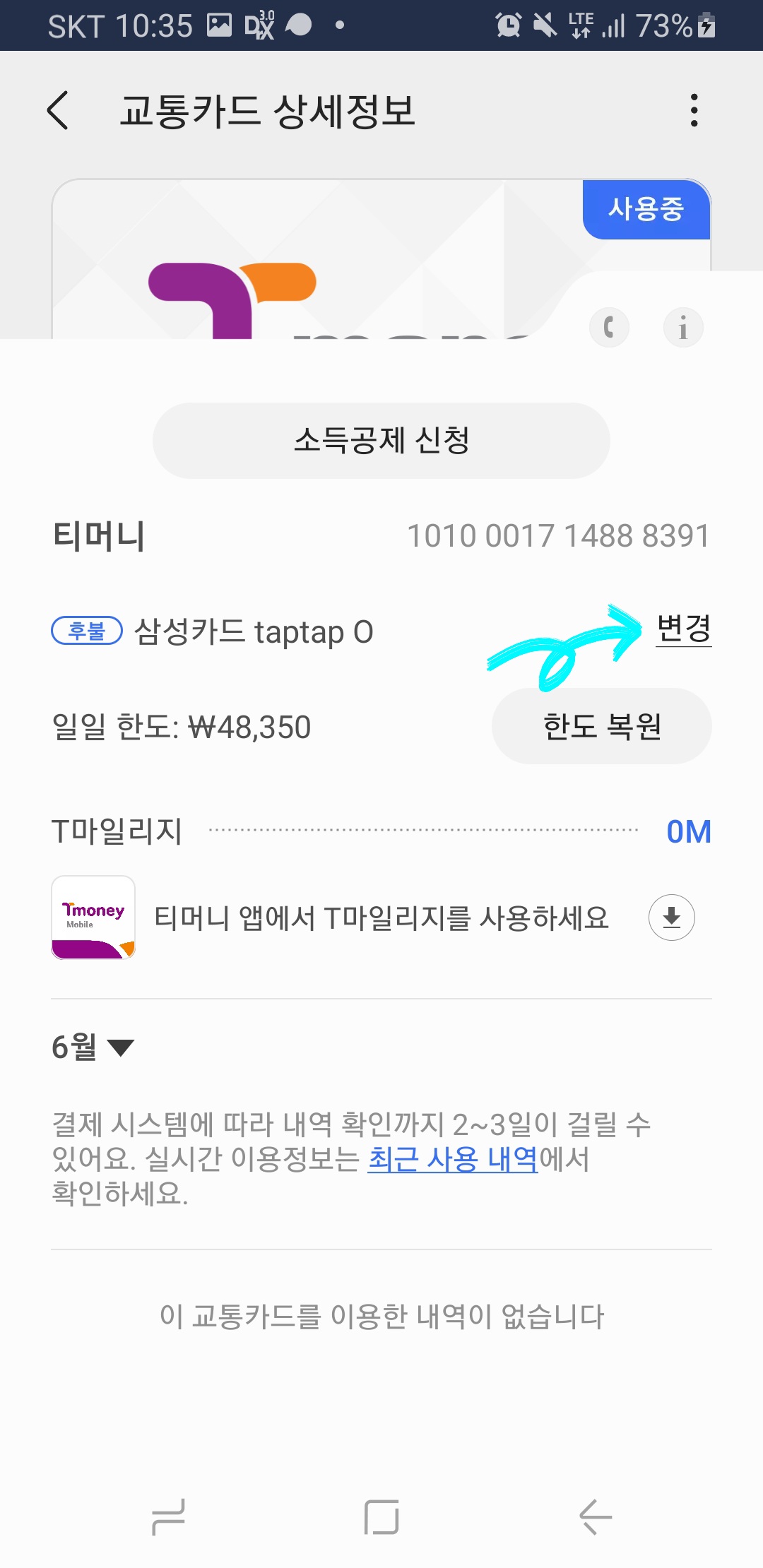 3. 교통카드 화면에 들어오시면 중간에 카드정보 중에서 변경을 눌러주세요.