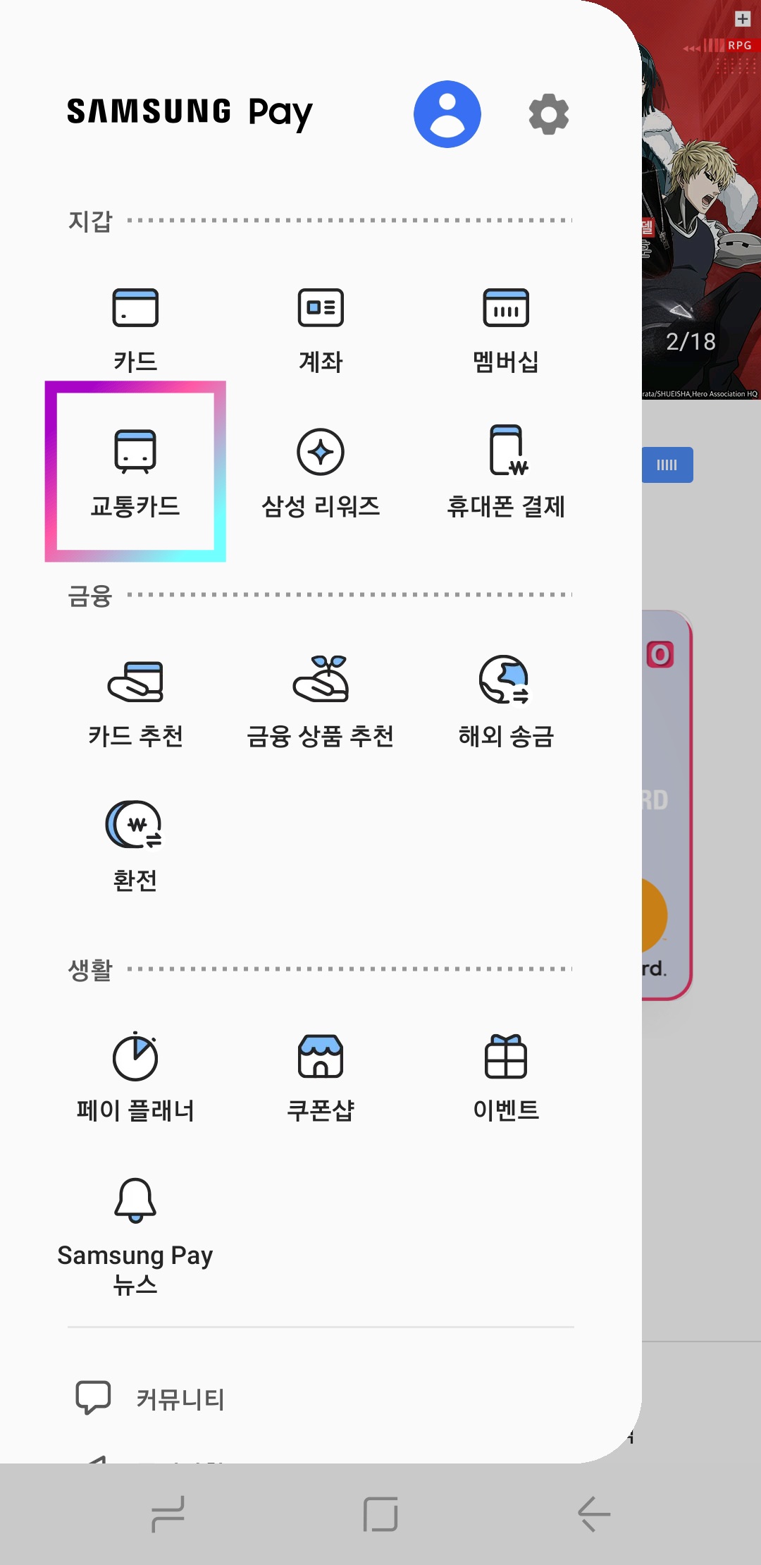 2. 메뉴탭이 나타나면 교통카드를 선택해 주세요!