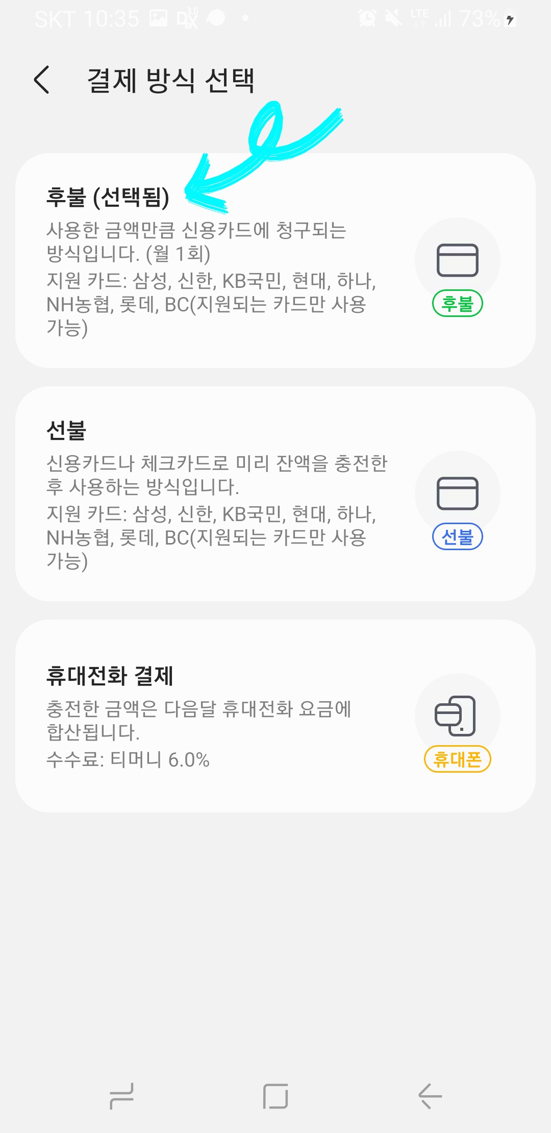 5. 후불을 선택하면 후불교통카드로 사용될 카드를 직접 선택하시면 됩니다!