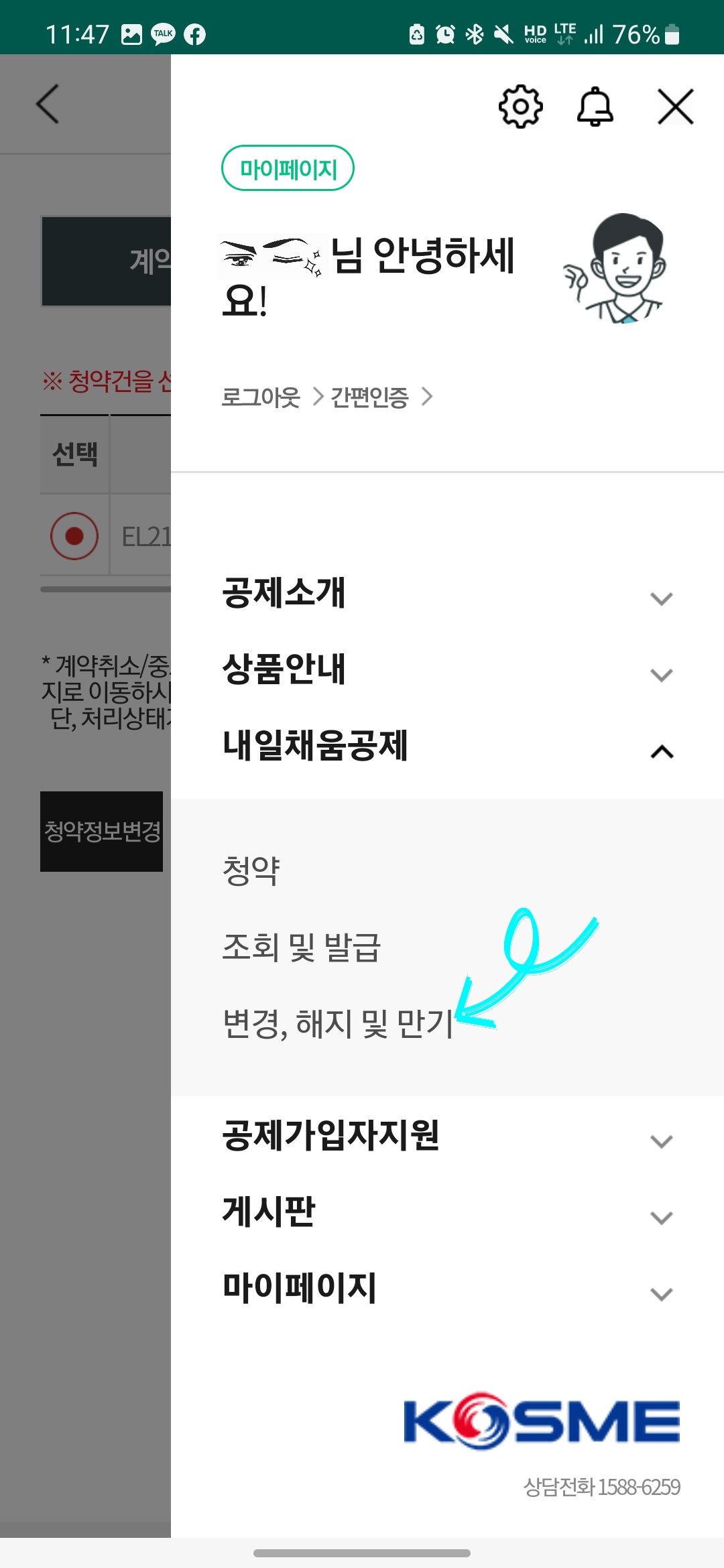 먼저 모바일이신 분들은 KOSME 어플을 다운받아서 실행시킨 후 우측 상단 설정 버튼을 눌러서 공동인증서 또는 간편 인증으로 로그인한 이후 [내일채움공제 - 변경, 해지 및 만기] 항목을 선택해 주세요!