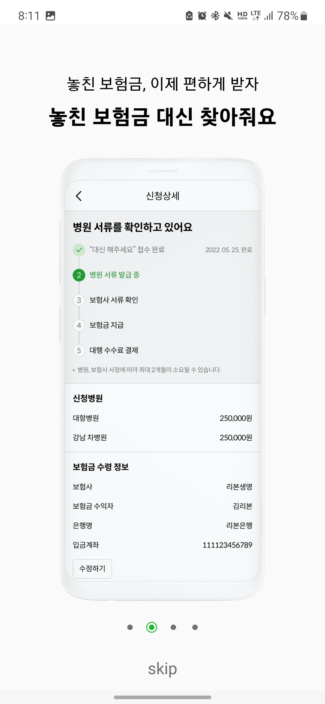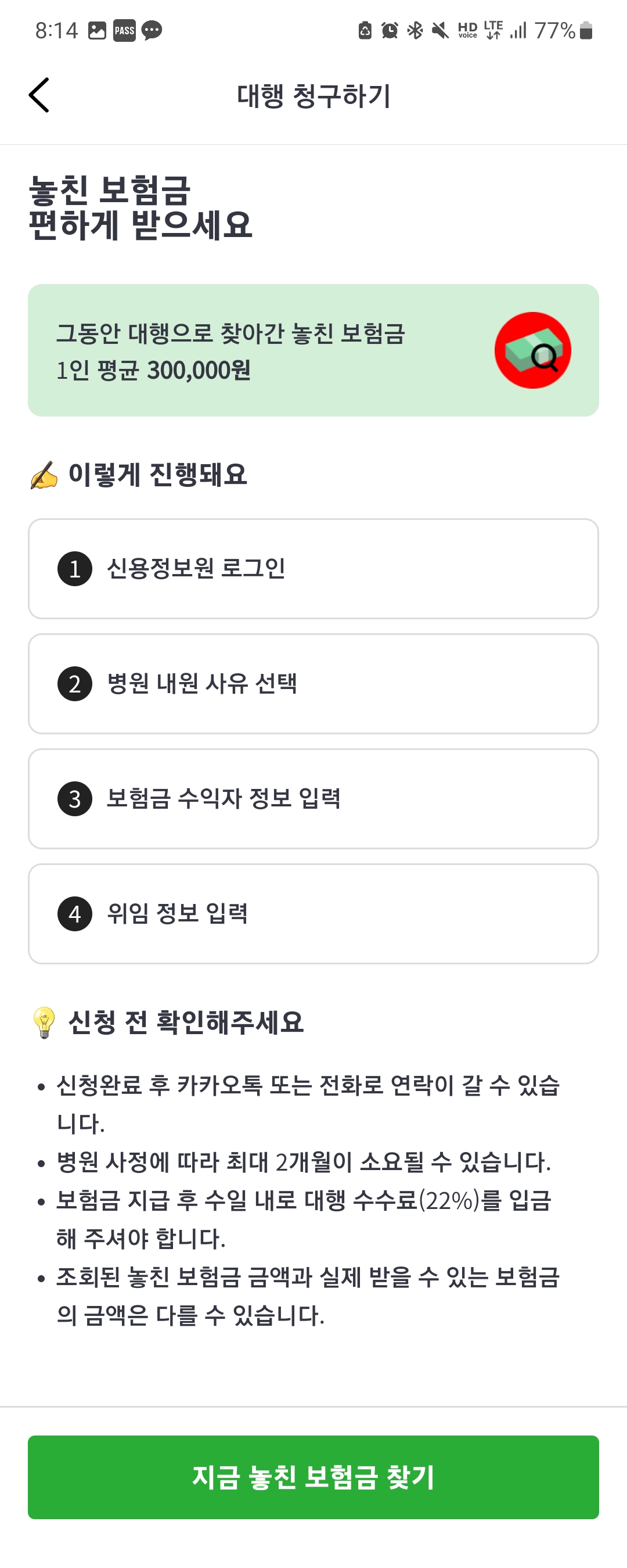 놓친 보험금을 조회하신 후 보험금 환급 절차를 대행 서비스로 할 것인지, 본인이 직접 서류를 제출할 것인지 선택하시면 됩니다.
