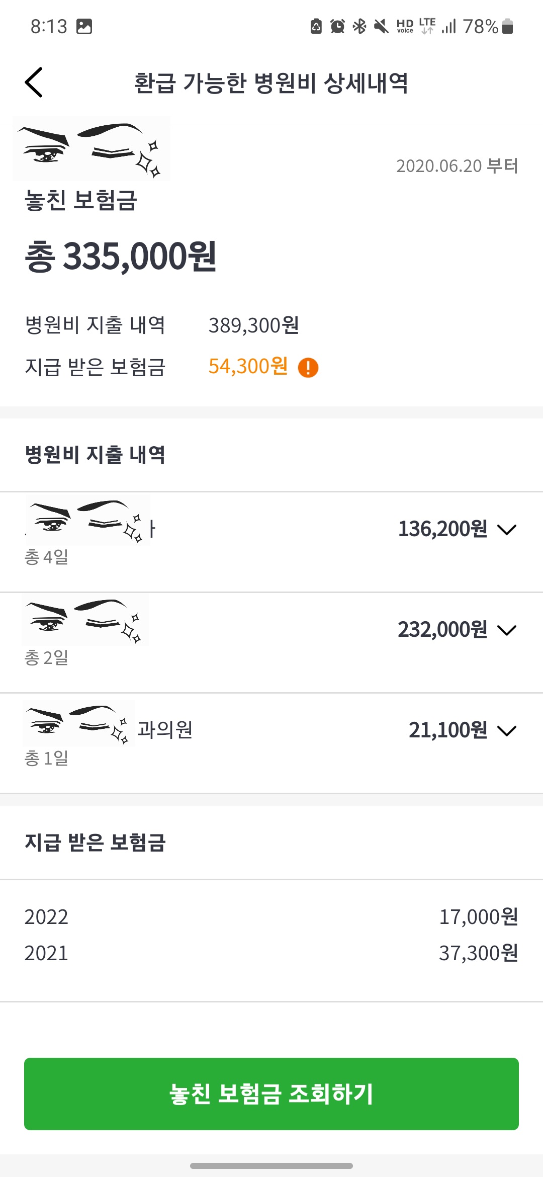 저는 조회해 보니 총 335,000원의 놓친 보험금을 찾을 수 있었고 병원비 지출 내역을 통해 예전 기억을 다시 되돌릴 수 있었습니다 ㅎㅎ