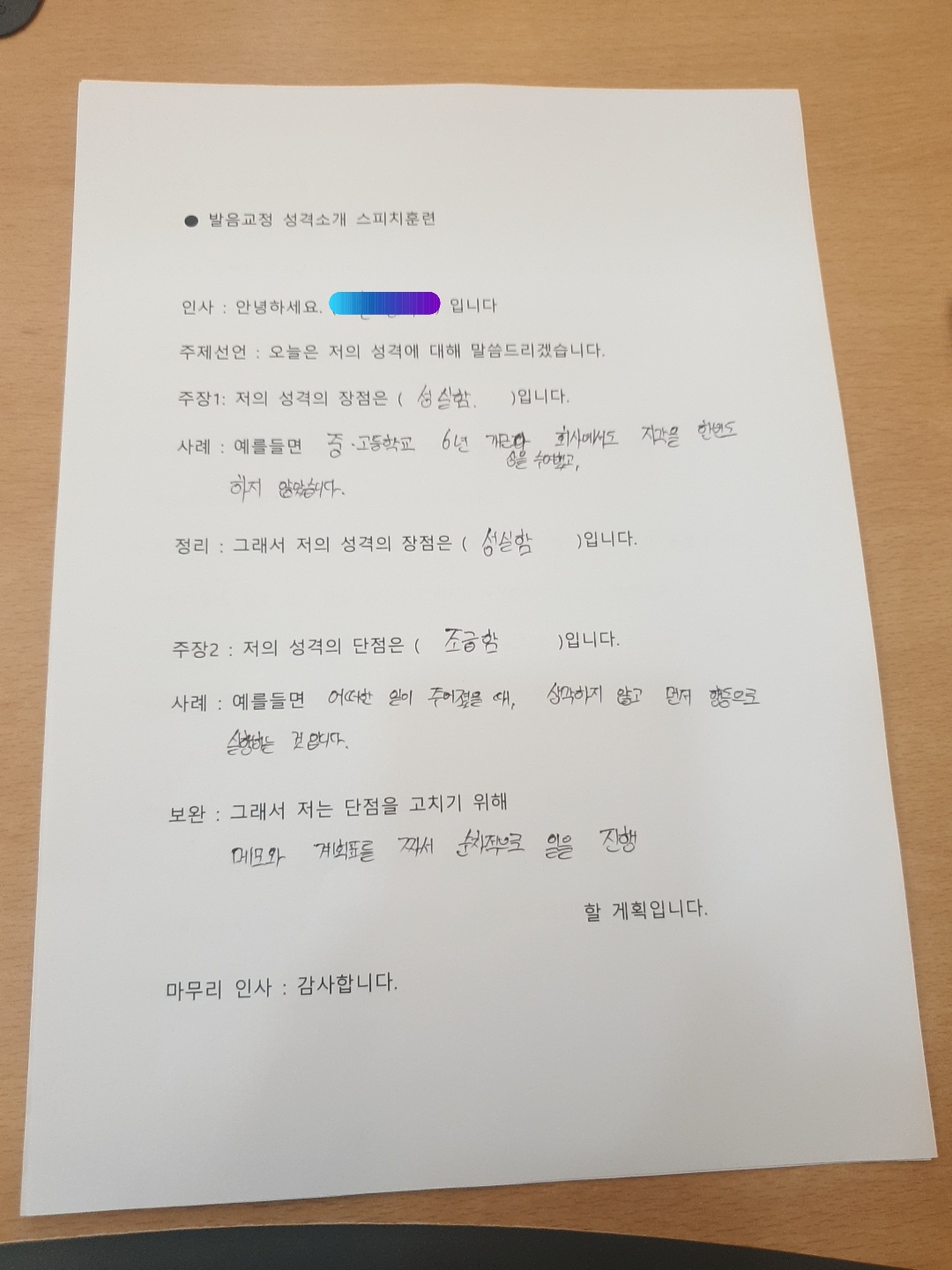 시간이 지나서 테스트를 받고 자기소개 문장들을 막힘없이 스피치 했습니다!