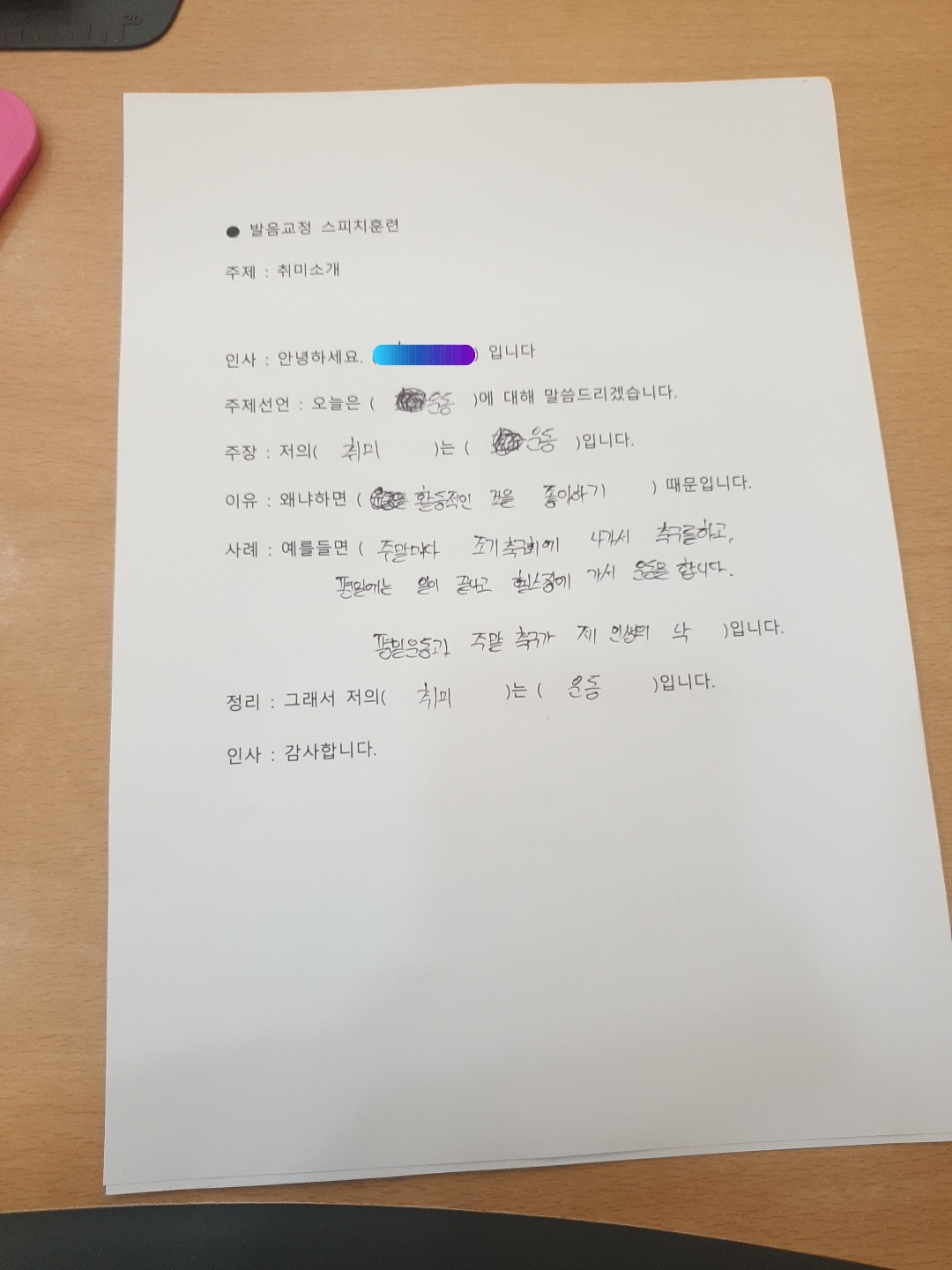 스피치가 끝나고는 원장선생님이 일상생활에서 잘되지 않았던 단어나 문장 혹은 유독 어려운 발음이 있냐고 물어보셨고, 저는 ㅊ,ㅈ,ㅅ 이 연속으로 들어가는 단어가 잘 안되고 일상생활에서 내가 발음을 잘 하고 있는지 모르겠다고 말씀드렸습니다.