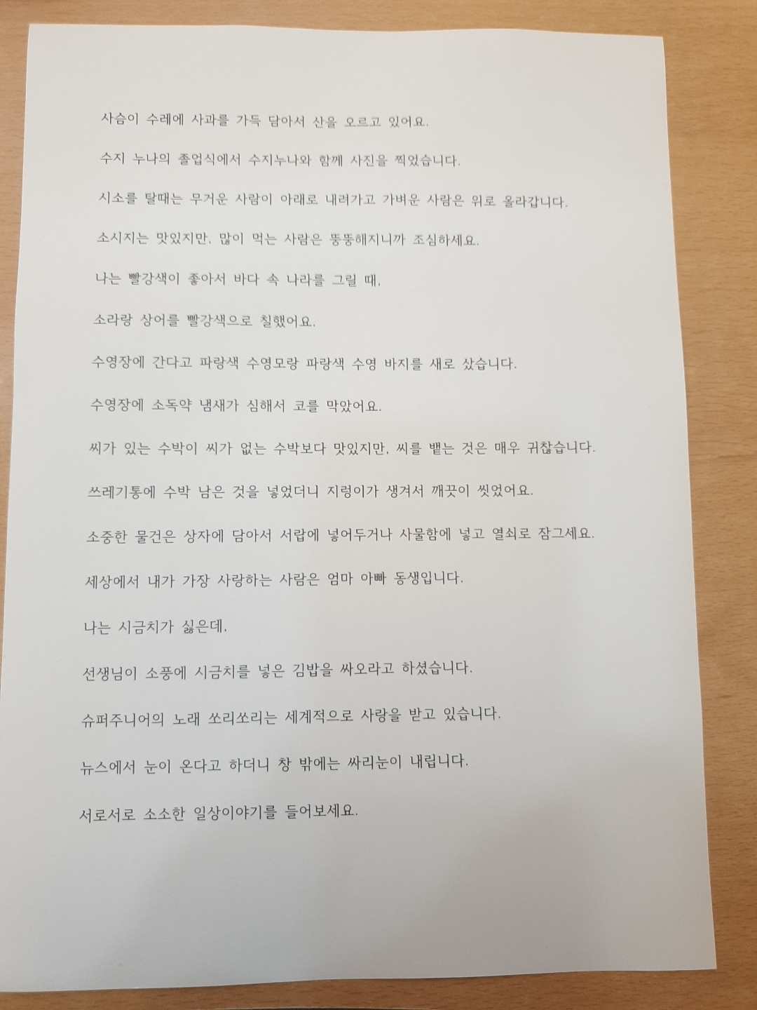숫자에는 십, 칠, 삼, 사 등 연속접으로 ㅅ,ㅊ이 들어가는게 많아서 연습하기 좋았고, 특히 숫자중에 77,43 이 두 숫자가 잘 되지 않았습니다.