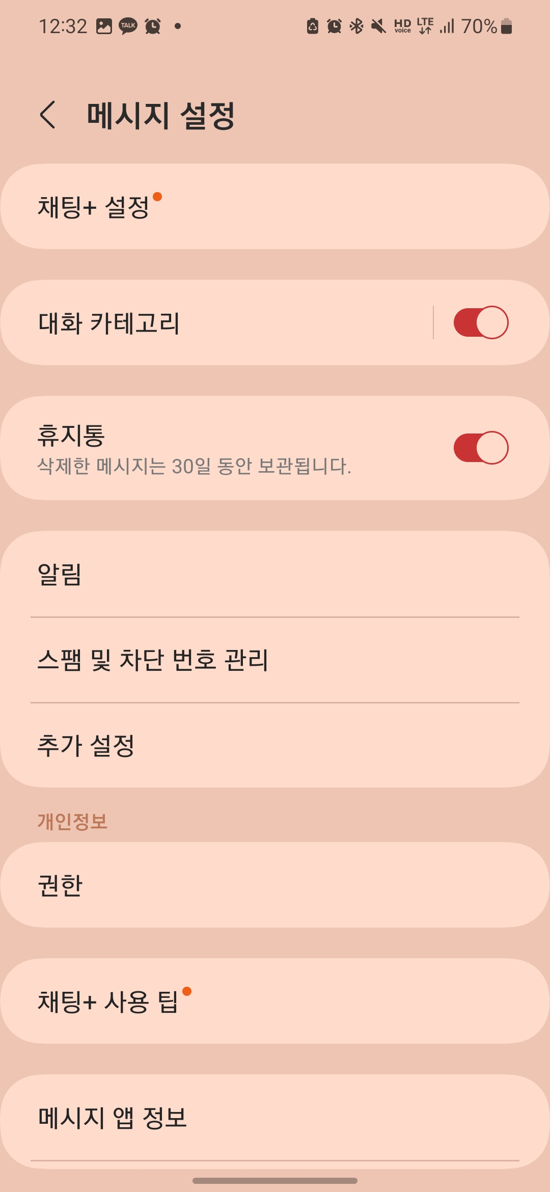 갤럭시 메시지 앱에서 스팸 및 차단 번호 관리 설정이 가능한데, 주기적으로 오는 스팸 문자나 모르는 번호에 대한 차단을 할 수 있어서 유용한 기능입니다!