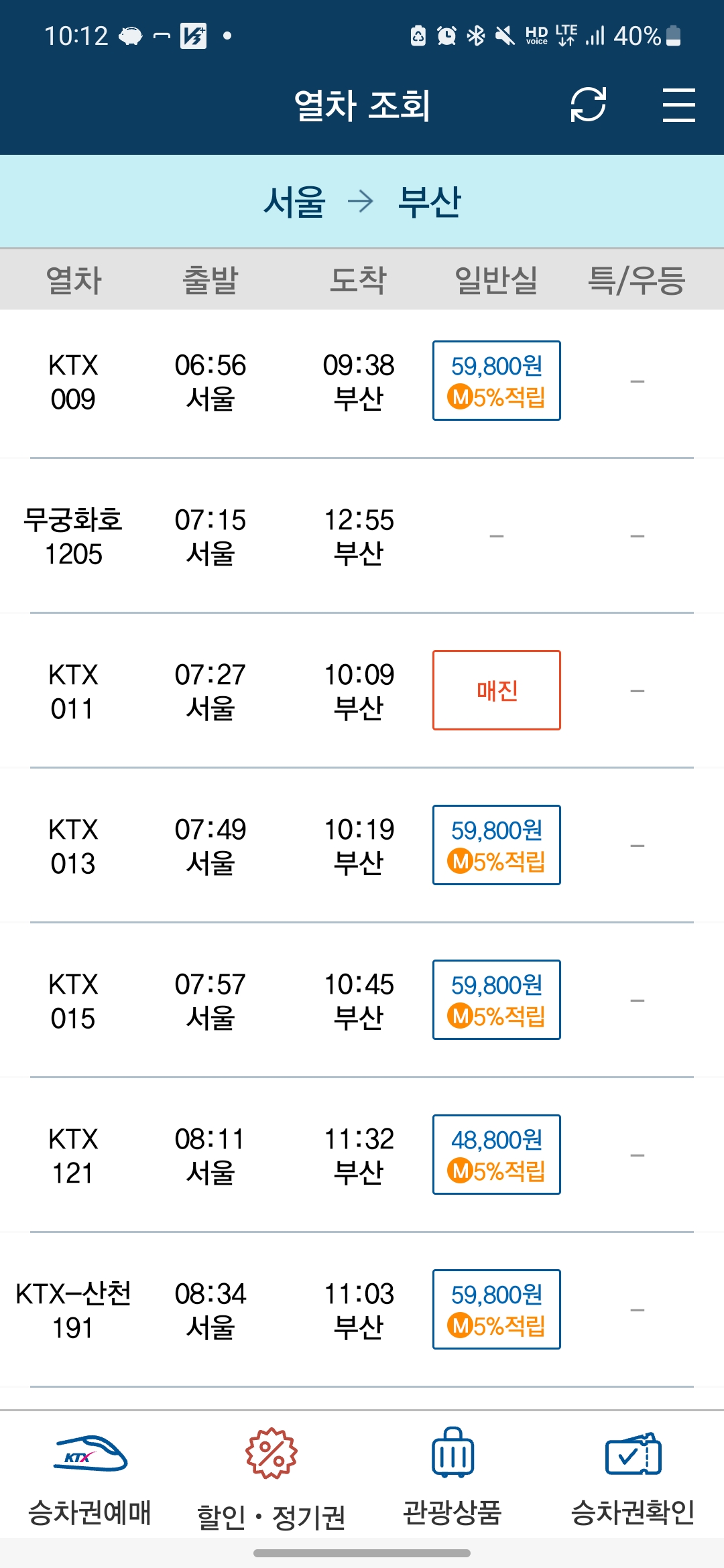 아래는 일반석이 매진되었어도, 대피도우미석으로 추가 예매가 가능하다는 것을 보여드리기 위해 크리스마스이브 기준 서울 -> 부산행 열차를 조회한 것입니다.