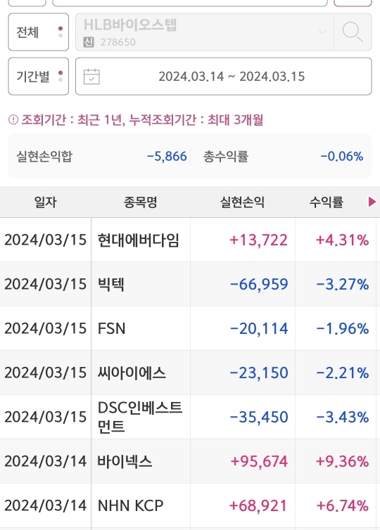 수익이난 종목 현대에버다임, 바이넥스, NHN KCP 중 현대에버다임과 바이넥스는 양음양 패턴이 정확히 들어맞았다. 다만 현대에버다임은 1호가 차이로 갭상승에 매도하지 못했는데 매도타점이 조금 아쉬웠다. 바이넥스는 한번 뺏다가 다시 올라갔는데 급하게 처분하지 않고 기다렸는데 팔렸다. NHN KCP의 경우 지속적인 상승추세와 결재쪽 강한 테마 수급으로 인해 쉽게 가격이 떨어지지 않았는데 저점에 잘 잡아서 기다려서 잘 판 케이스이다.